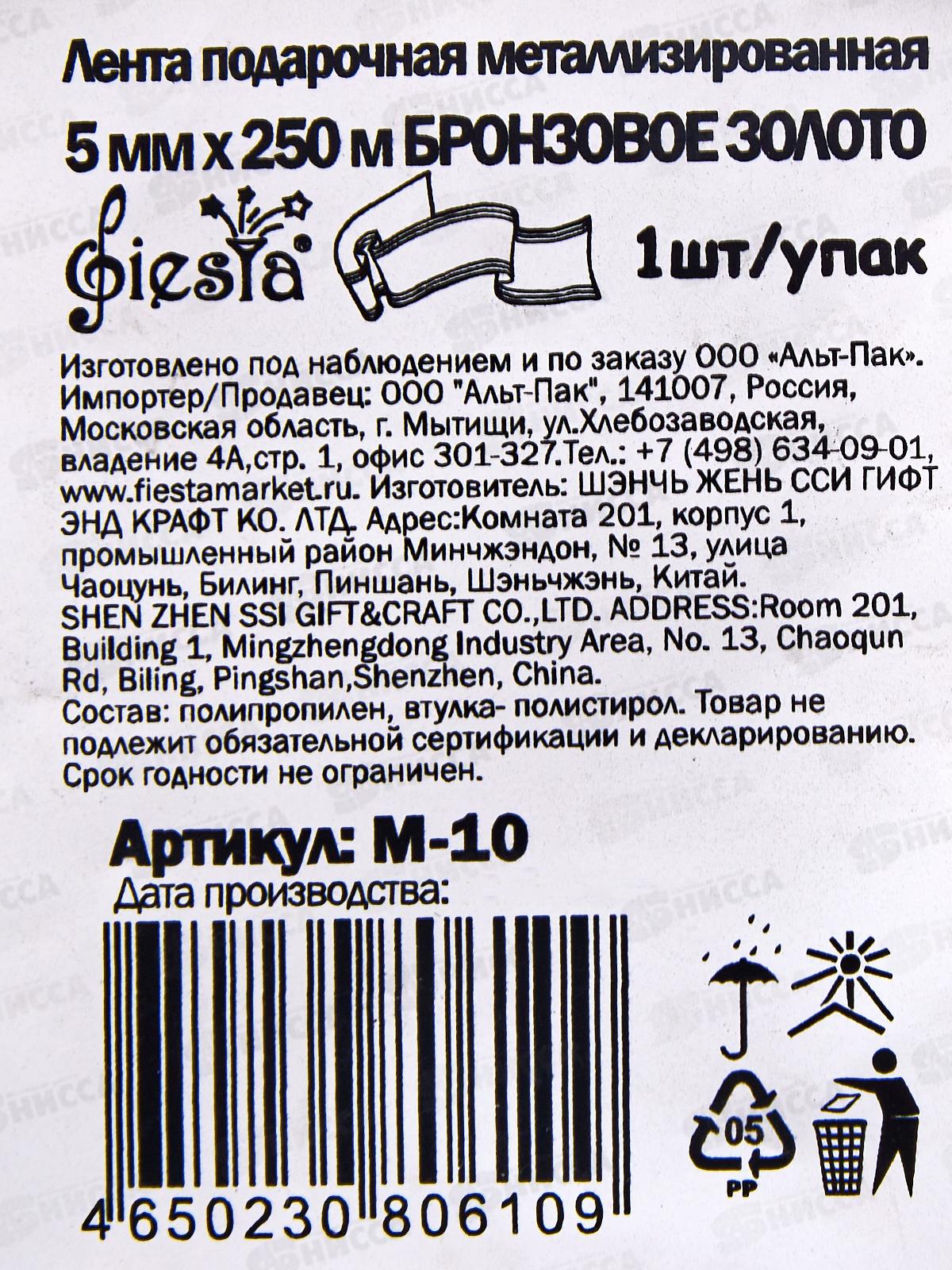 Лента подарочная Fiesta металлизированная 5мм/250м бронз.золот M-10 *4