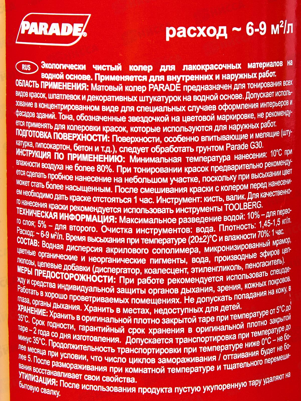 Экологически чистый колер для лакокрасочных материалов на водной основе. Для внутренних и наружных работ. Предназначен для тонирования всех видов красок, шпатлевок и декоративных штукатурок на водной основе. Допускает использование в концентрированном виде для специальных случаев оформления интерьеров и фасадов зданий. Тона, обозначенные звездочкой на цветовой маркировке, не рекомендуется применять для колеровки красок, которые используются для наружных работ. Обладает отличной атмосферостойкостью, светостойкостью, прочностью к истиранию При тонировании красок предварительно рекомендуется сделать пробное нанесение на небольшом участке, поскольку при высыхании цвет может стать более насыщенным.
