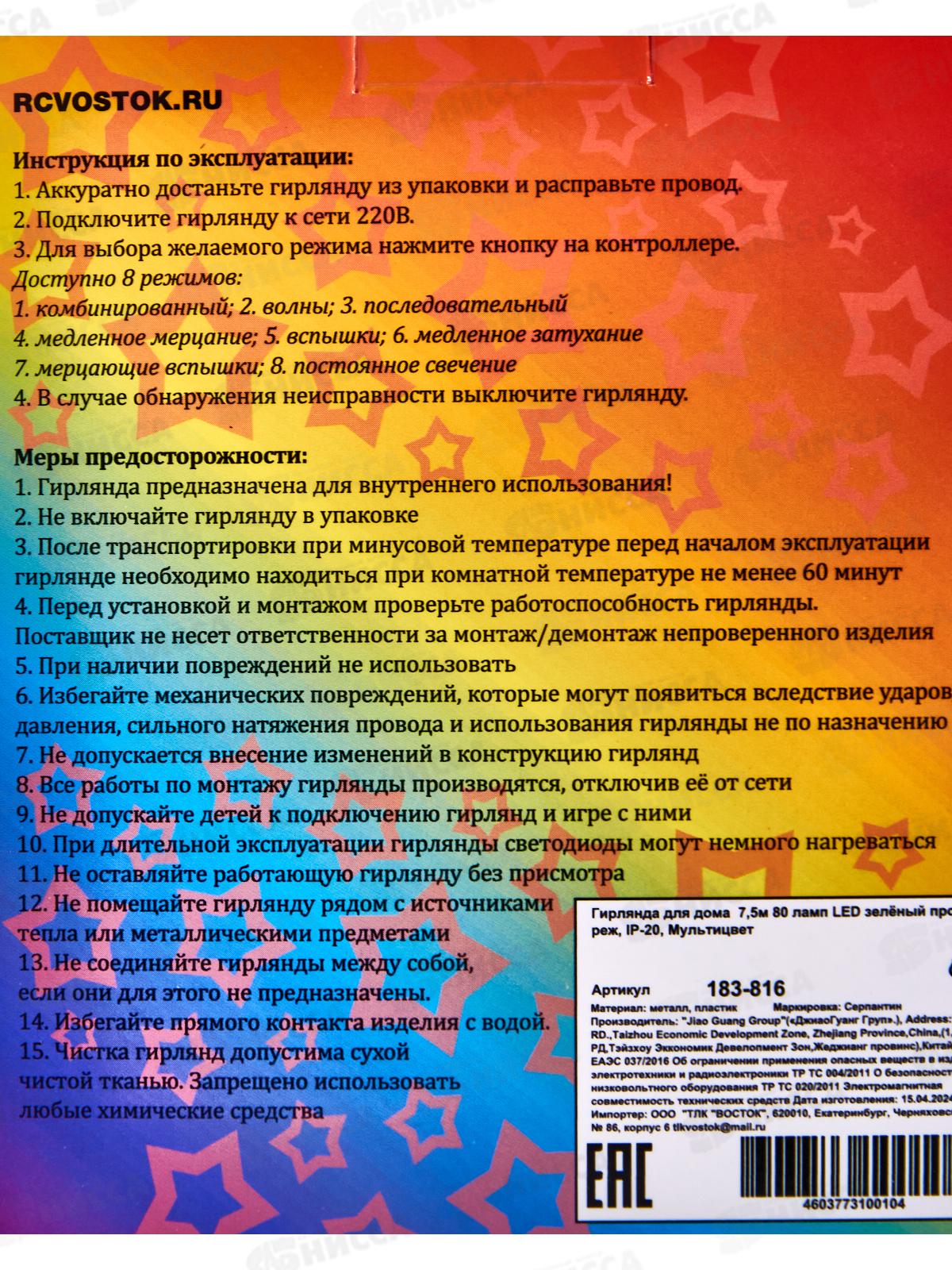 Гирлянда 7,5м 80LED 8 реж мульти 183-816