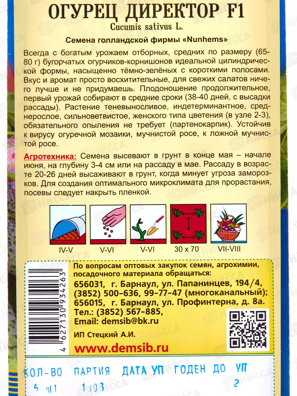 Всегда с богатым урожаем отборных, средних по размеру (65-80 г) бугорчатых огурчиков -корнишонов идеальной цилиндрической формы, насыщенно тёмно-зелёных с короткими полосами. Вкус и аромат просто восхитительные, для свежих салатов ничего лучше и не придумаешь. Плодоношение продолжительное, первый урожай собирают в средние сроки (38-40 дней, с высадки рассады). Растение теневыносливое, индетерминантное, среднерослое, сильноветвистое, женского типа цветения (в узле 2-3), обязательного опыления не требует (партенокарпик). Устойчив к вирусу огуречной мозаики, мучнистой росе, к ложной мучнистой росе.