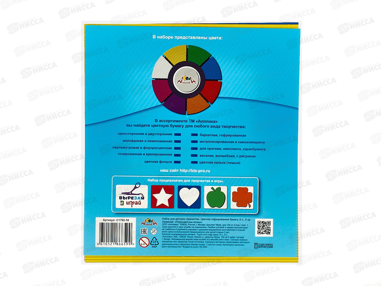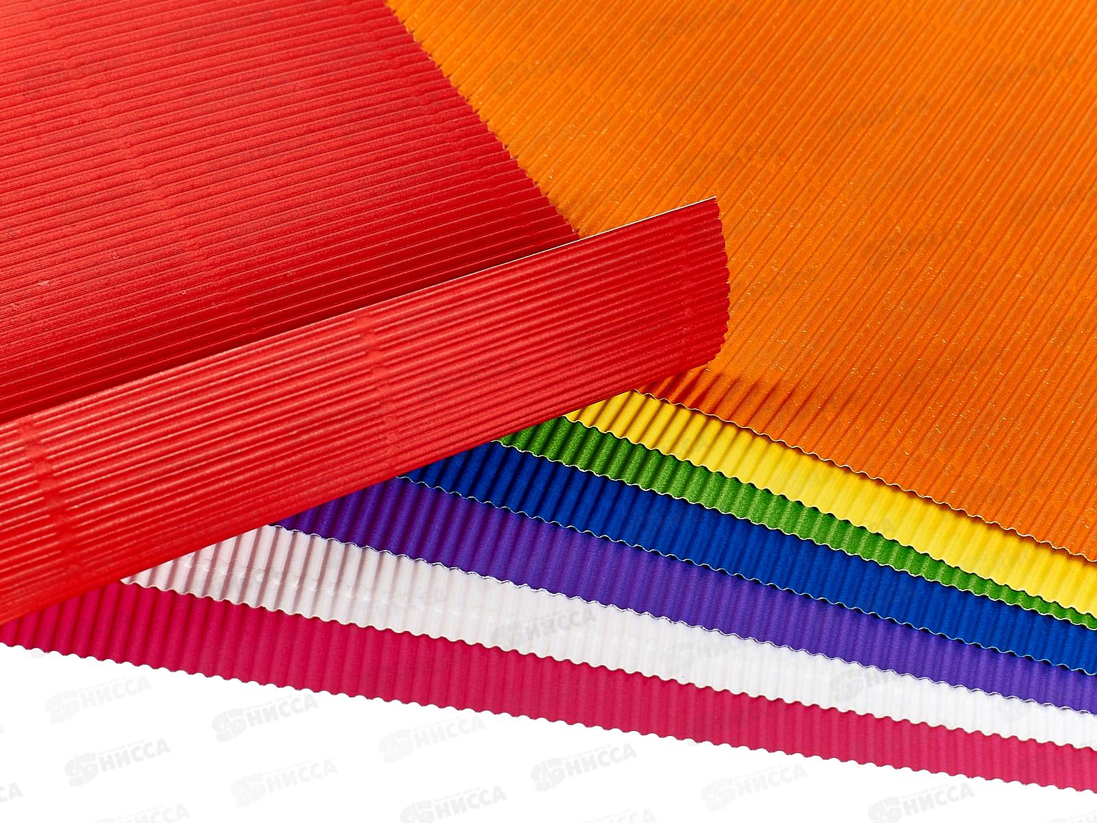 Цветная гофрированная бумага 8 листов, 8 цветов, формат А5, плотность 80 гр/м2. Внутренний блок - офсетная бумага, имеющая волнообразную форму. В наборе цвета: красный, синий, зеленый, желтый, оранжевый, белый, фиолетовый, малиновый. Упаковка - ПЭТ пакет с 2-мя вкладышами из мелованного картона. Рекомендуется детям от 3 лет.
