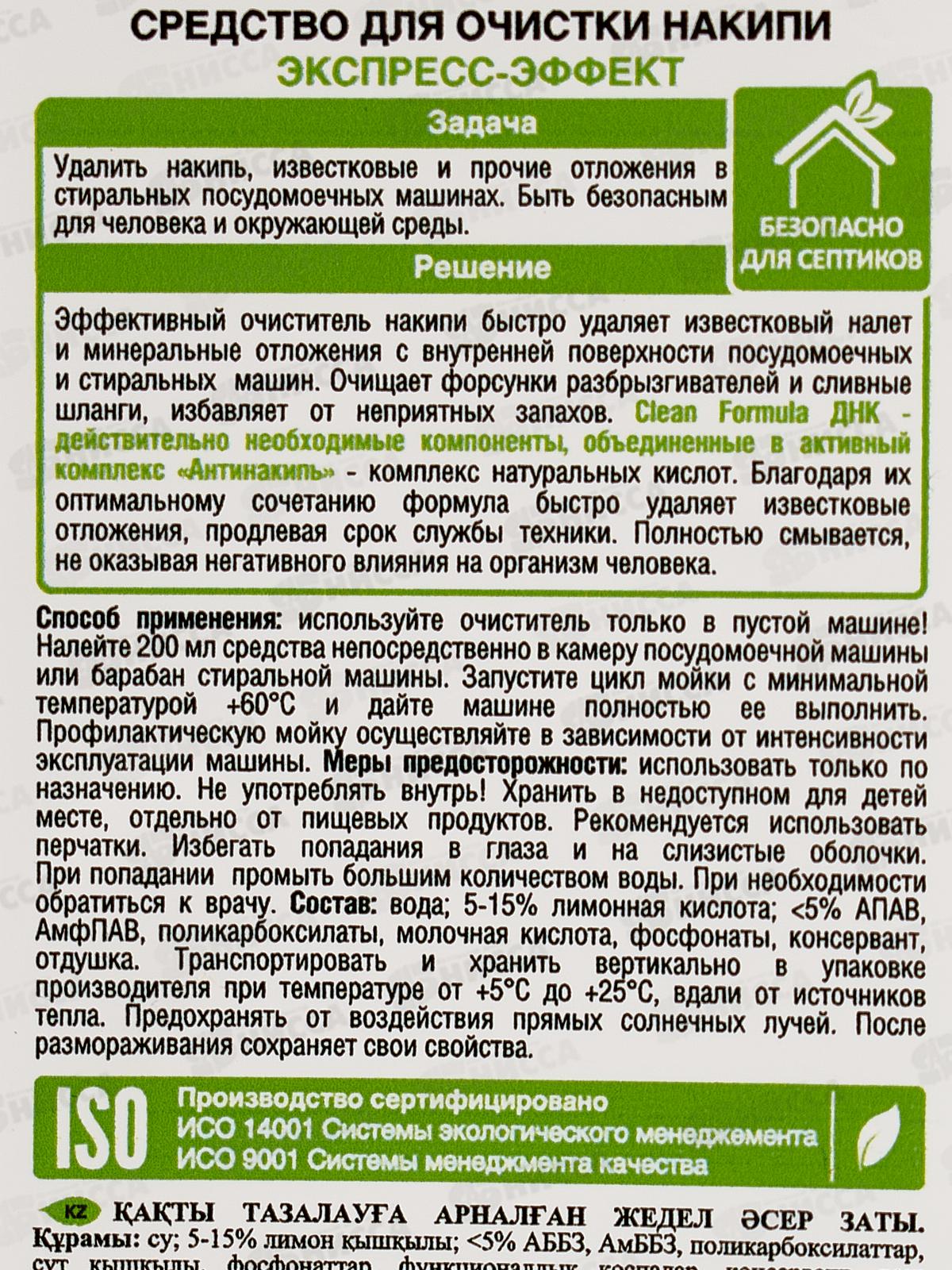 Состав: вода; 5-15% лимонная кислота; <5% АПАВ, АмфоАВ, поликарбоксилаты, молочная кислота, фосфонаты, метилхлороизотиазолинон, метилизотиазолинон, отдушка.