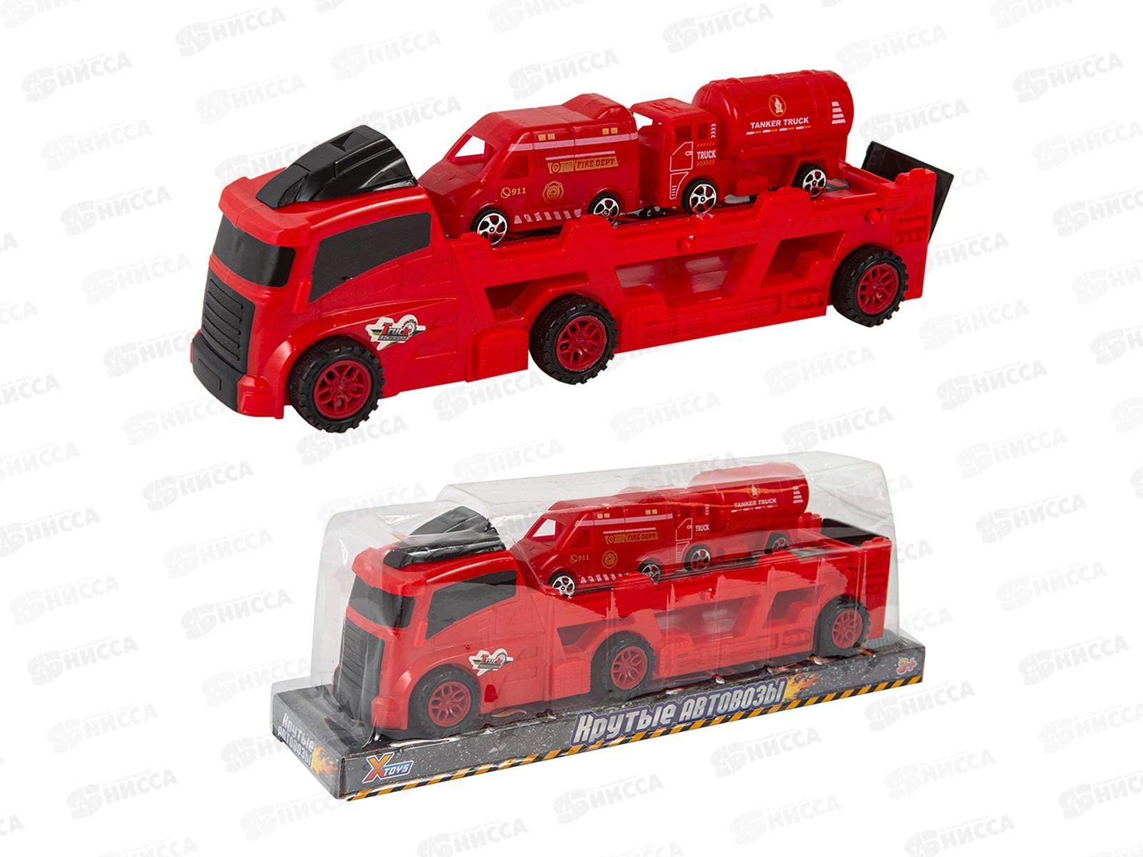 Игрушка Грузовик со спецтехникой. Серия: "Автовозы. Крутые перевозчики". Состав: автовоз - 1 шт., спецтехника - 2 шт. (фургон и грузовик в ассортименте). Особенности: открывающаяся задняя дверь у автовоза, инерционный механизм у спецтехники для езды.