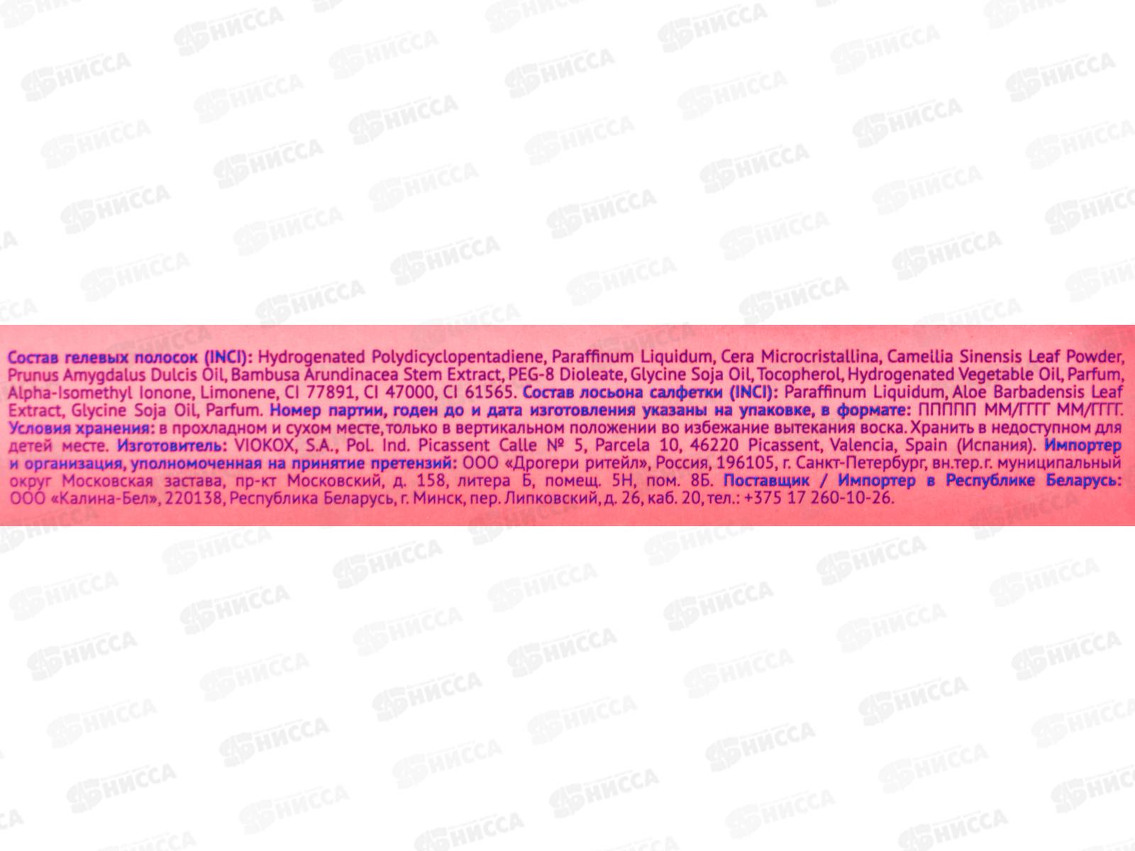 Гелевые полоски не требуют разогрева, подходят для чувствительной кожи. Обеспечивают гладкость до 30 дней. Удаляют волосы от 1 мм, не травмируют кожу. Преимущества: Усовершенствованная формула гелевых полосок обладает повышенным сцеплением, что позволяет удалять нежелательные волоски с первого рывка. Благодаря коллоидной 3D структуре, гель захватывает нежелательные волоски от 1 мм и не требует разогрева. Состав: Hydrogenated Polydicyclopentadiene, Paraffinum Liquidum, Cera Microcristallina, Camellia Sinensis Leaf Powder, Prunus Amygdalus Dulcis Oil, Bambusa Arundinacea Stem Extract, PEG-8 Dioleate, Glycine Soja Oil, Tocopherol, Hydrogenated Vegetable Oil, Parfum, Alpha-Isomethyl Ionone, Limonene, CI 77891, CI 47000, CI 61565. Состав лосьона салфетки (INCI): Paraffinum Liquidum, Aloe Barbadensis Leaf Extract, Glycine Soja Oil, Parfum.