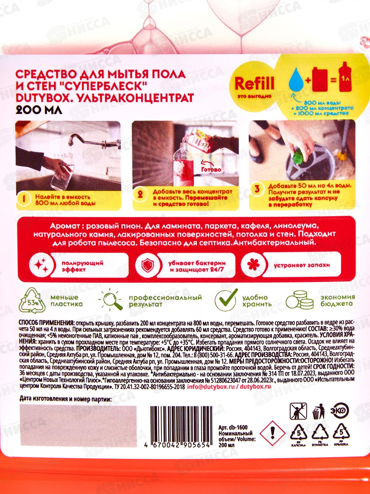 Dutybox средство для мытья пола и стен "Суперблеск" концентрат 200мл, 1600