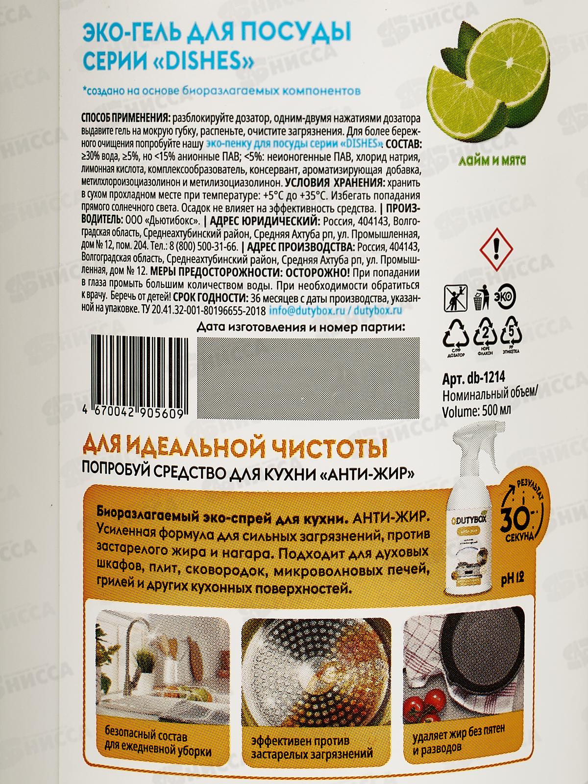 Dutybox Эко-гель для посуды Лайм и мята 500мл, 1214