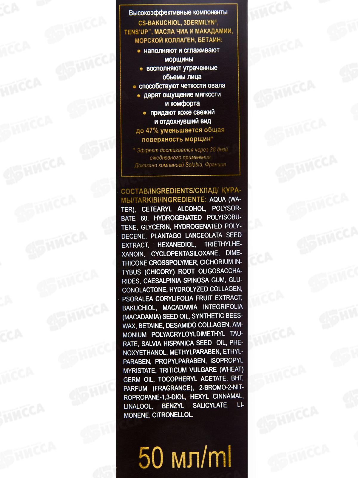 Ночной крем разработан для зрелой кожи после 50 лет. Он восстанавливает и обновляет кожу во время сна. Состав: Aqua (Water), Cetearyl Alcohol, Polysorbate 60, Water, Plantago lanceolata seed extract, Hexanediol, Hydrogenated Polyisobutene, Hydrogenated Polydecene, Glycerin, Triethylhexanoin, Cyclopentasiloxane, Dimethicone Crosspolymer, Psoralea Corylifolia Fruit Extract, Bakuchiol, Hydrolyzed Collagen, Cichorium Intybus (Chicory) Root Oligosaccharides, Caesalpinia Spinosa Gum, Gluconolactone, Synthetic Beeswax, Desamido Collagen, Macadamia Integrifolia (Macadamia) Seed Oil, Betaine, Ammonium Polyacryloyldimethyl Taurate, Phenoxyethanol, Methylparaben, Ethylparaben, Propylparaben, Isopropyl Myristate, Triticum Vulgare (Wheat) Germ Oil, Tocopheryl Acetate, BHT, Parfum (Fragrance), SALVIA HISPANICA SEED OIL, 2-Bromo-2-Nitropropane-1,3-Diol, Sodium Hydroxide, Hexyl Cinnamal, Linalool, Benzyl Salicylate, Limonene, Citronellol.