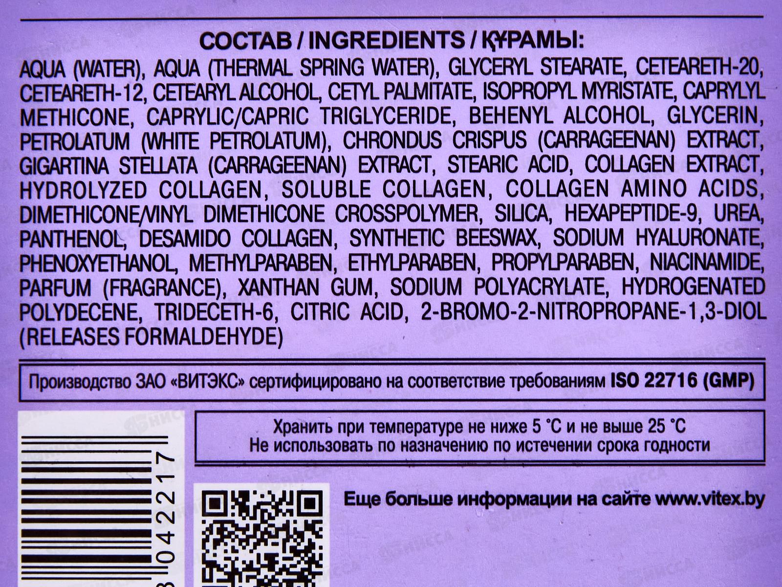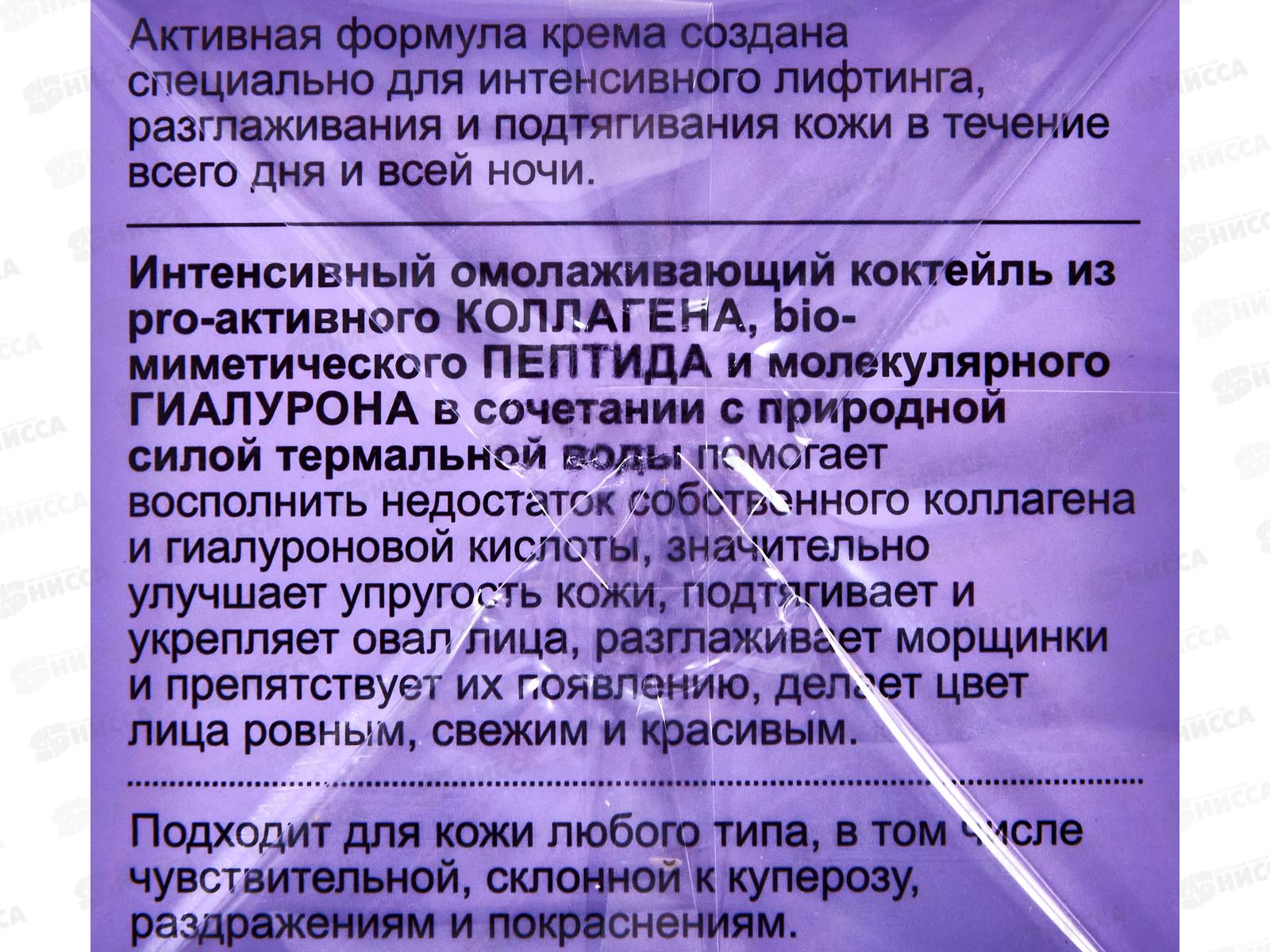Активная формула крема создана специально для интенсивного лифтинга, разглаживания и подтягивания кожи в течение всего дня и всей ночи. Состав: вода, термальная вода, глицерилстеарат, цетерет-20, цетерет-12, цетеариловый спирт, цетилпальмитат, изопропилмиристат, каприлилметикон, глицерилтрикаприлат/капрат, бегениловый спирт, глицерин, вазелин, экстракт Chrondus Crispus (карагинана), экстракт Gigartina Stellata (карагинана), стеариновая кислота, экстракт коллагена, гидролизованный коллаген, растворимый коллаген, аминокислоты коллагена, кроссполимер диметикона и винилдиметикона, диоксид кремния, гексапептид-9, воск пчелиный синтетический, мочевина, пантенол, дезамидоколлаген, гиалуронат натрия, феноксиэтанол, метилпарабен, этилпарабен, пропилпарабен, ниацинамид, парфюмерная композиция, ксантановая камедь, полиакрилат натрия, гидрогенизированный полидецен, тридецет-6, лимонная кислота, 2-бром-2-нитропропан-1,3-диол.