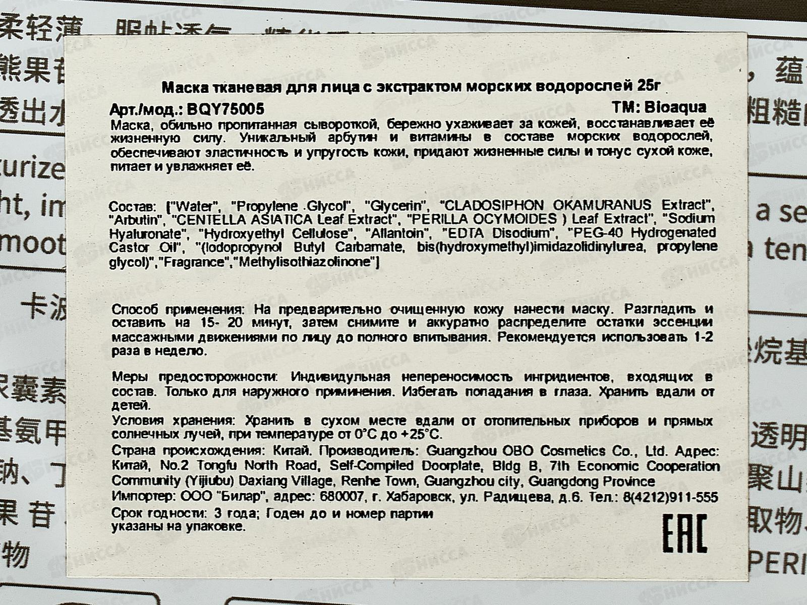 Bioaqua Маска тканевая для лица Увлаж суж поры Морские водоросли 25г *720