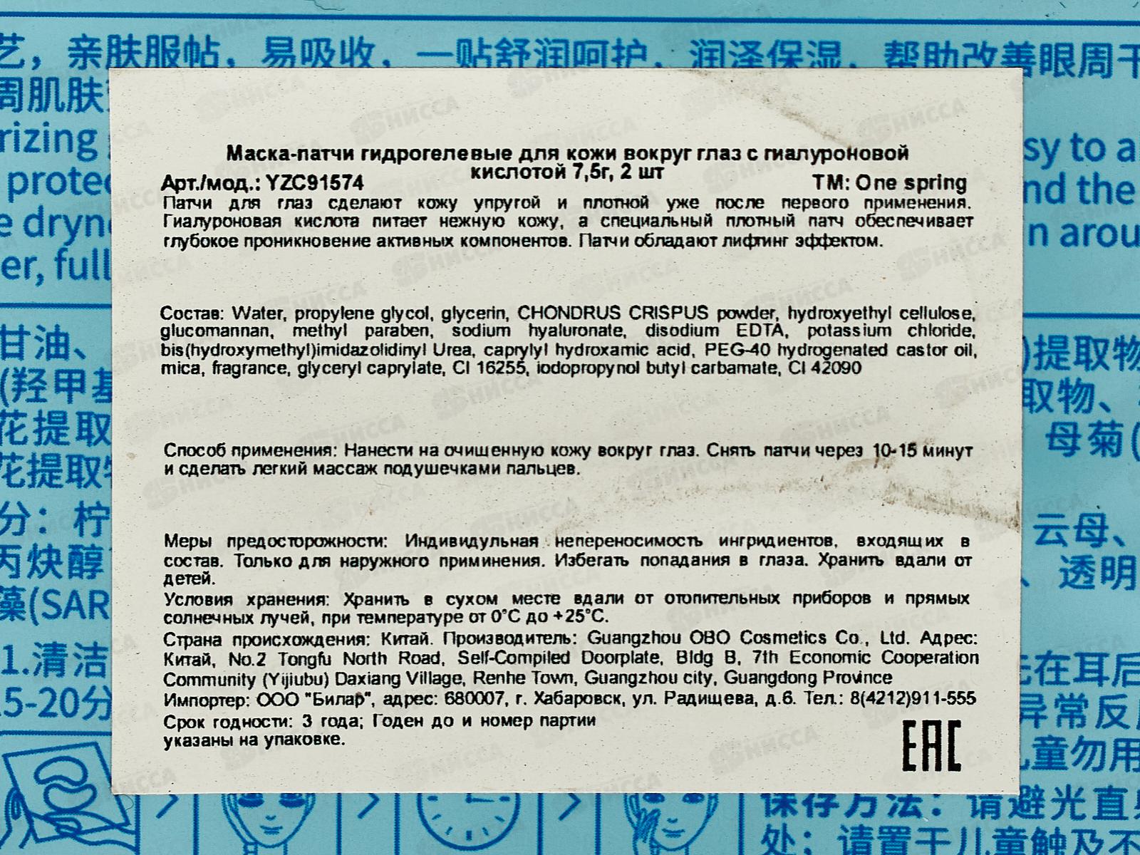 OBO One Spring патчи для глаз Увлажняющие с гиалуроном 7,5г 1пара *960