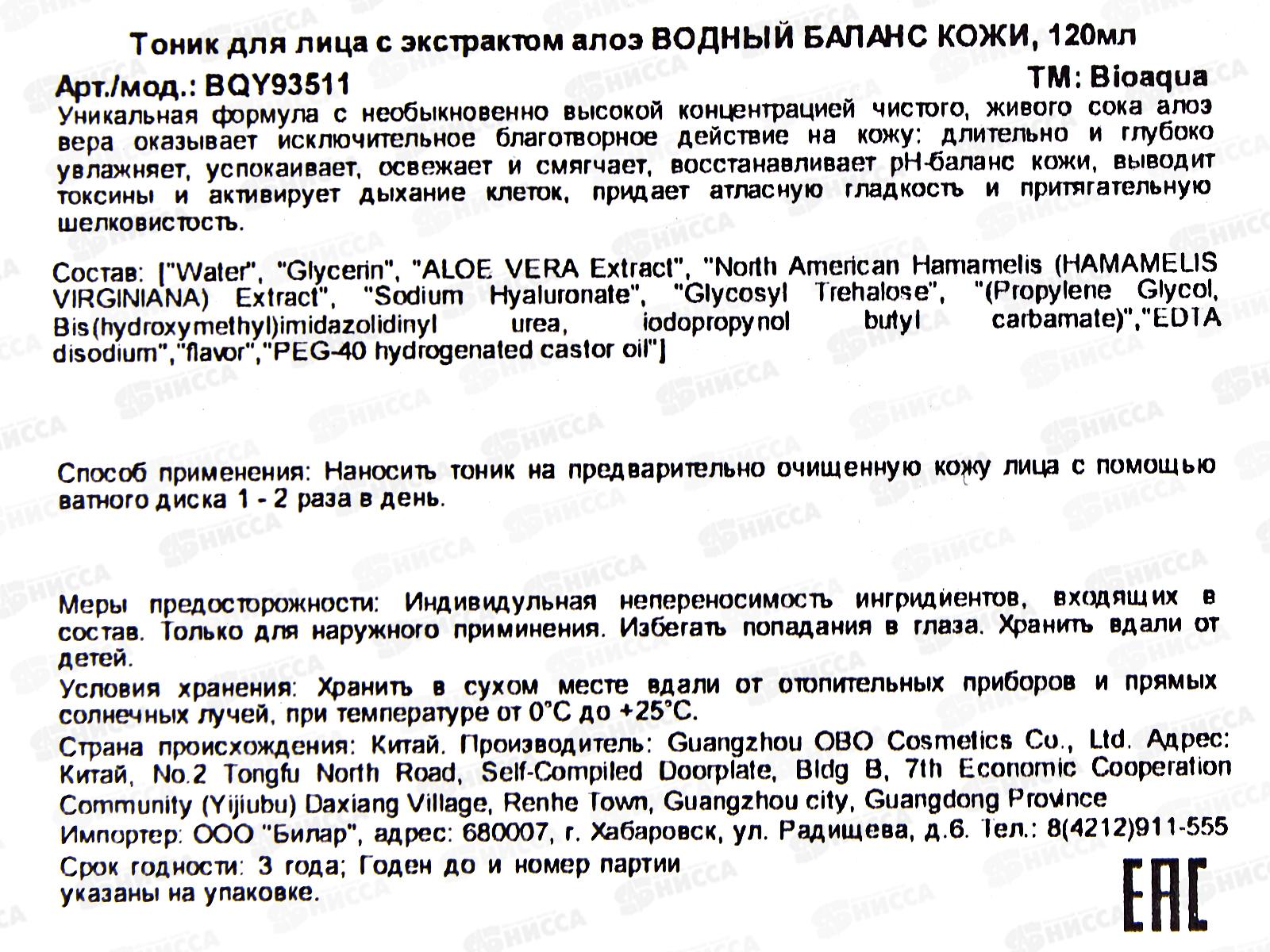 Bioaqua Тоник для лица с экстрактом Алоэ водн баланс кожи 120мл *96