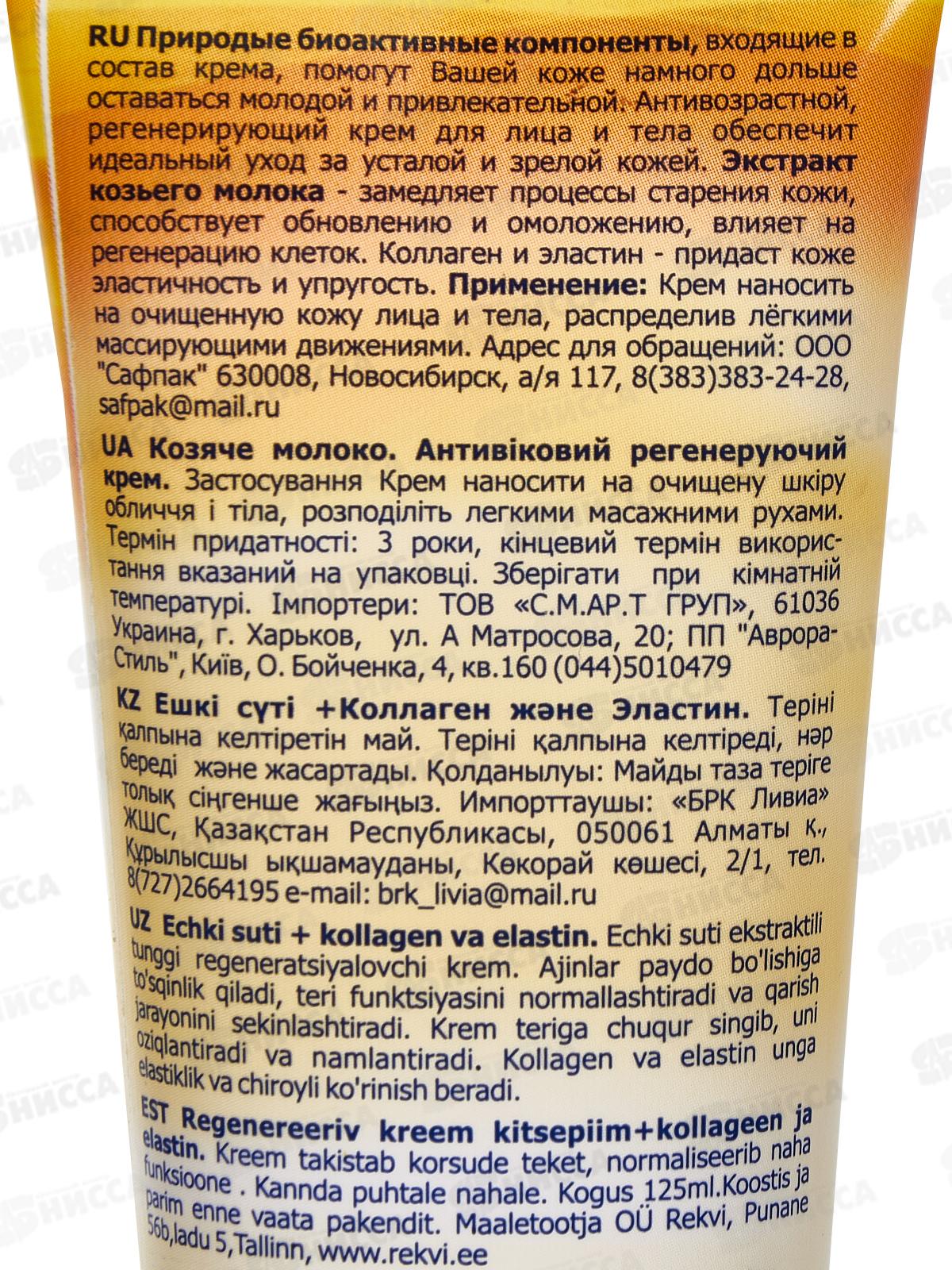 Крем является замечательным средством для ухода за кожей в зрелом возрасте. Обладает смягчающим и успокаивающим воздействием на кожу, активизирует выработку антиоксидантов, восстанавливает защитную функцию кожного покрова. Крем содержит полезные вещества, способствующие активизации жизнедеятельности клеток кожи. Регенерирующие свойства крема обеспечивают отличный результат его использования. Интенсивное увлажнение и питание сделают вашу кожу нежной, гладкой и шелковистой. Коллаген и эластин придадут эластичность. Содержащийся в козьем молоке коэнзим способствует интенсивному омоложению кожи. Кожа станет необычайно упругой и подтянутой. Замедлится деформация овала лица, которая является одним из самых неприятных последствий старения кожи. Крем прекрасно подходит для использования в качестве основного средства в процессе домашнего ухода за кожей лица. Универсален, подходит для любого типа кожи, заменит средства салонного ухода, придаст сияющий, здоровый вид вашей коже. Состав: Вода, Цетеарилэтилгексаноат, Глицерин, Диизостеароилполиглицерил-3 Димер Дилинолеат, гидрогенизированное пальмовое кизиловое масло, Лактобактерии/Сухое молоко/, Коллаген, Циклодекстрин, Ретинилпальмитат, Эластин, Токоферилпальмитат, Токоферилацетат, Цера Альба, Гидрогенизированное касторовое масло, сульфат магния, Бензонат натрия, 2-Бром-2-Нитропропан.-1,3-Диол, Отдушка, Линалоол, Цитронеллол, Гексилциннамал, Геранион, Эвгенол, Бензилсаликолат, Проппилпарабен 0,1-0,3%, Метилпарабен 0,1-0,3%, Бутилпарабен 0,1-0,3%, Альфа-Изометиллонон, Кумарин, D-лимонен.