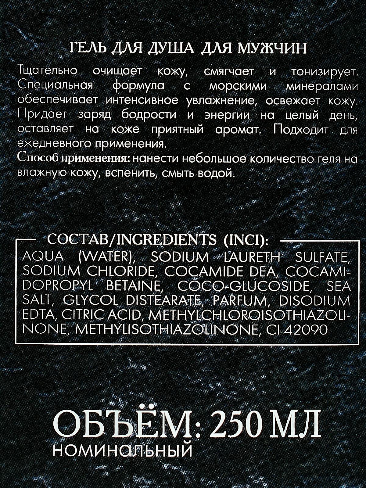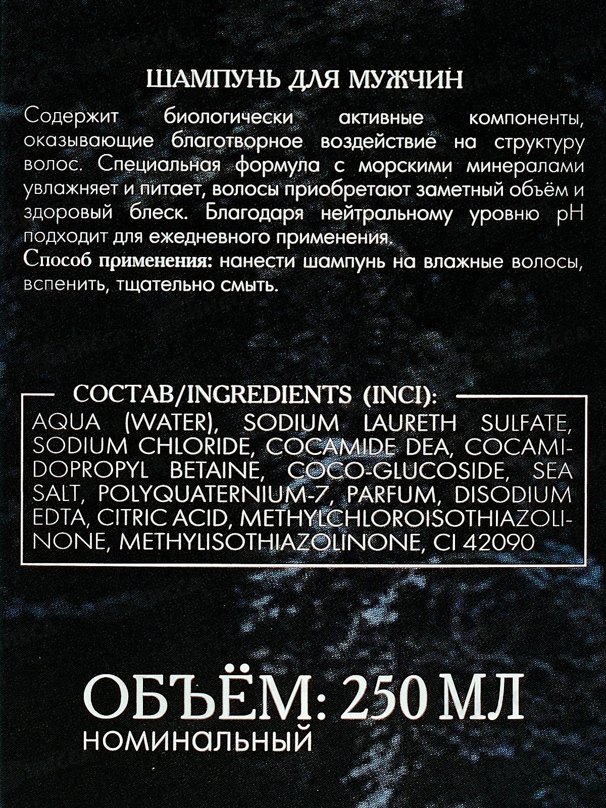 Состав шампуня: вода, лауретсульфат натрия, хлорид натрия, кокамид дэа, кокамидопропилбетаин, коко-глюкозид, морская соль, поликватерниум-7, отдушка, динатрий эдта, лимонная кислота, метилхлоризотиазолинон, метилизотиазолинон, CI 42090. Состав геля для душа: вода, лауретсульфат натрия, хлорид натрия, кокамид дэа, кокамидопропилбетаин, коко-глюкозид, морская соль, гликольдистериат, отдушка, динатрий эдта, лимонная кислота, метилхлоризотиазолинон, метилизотиазолинон, CI 42090.