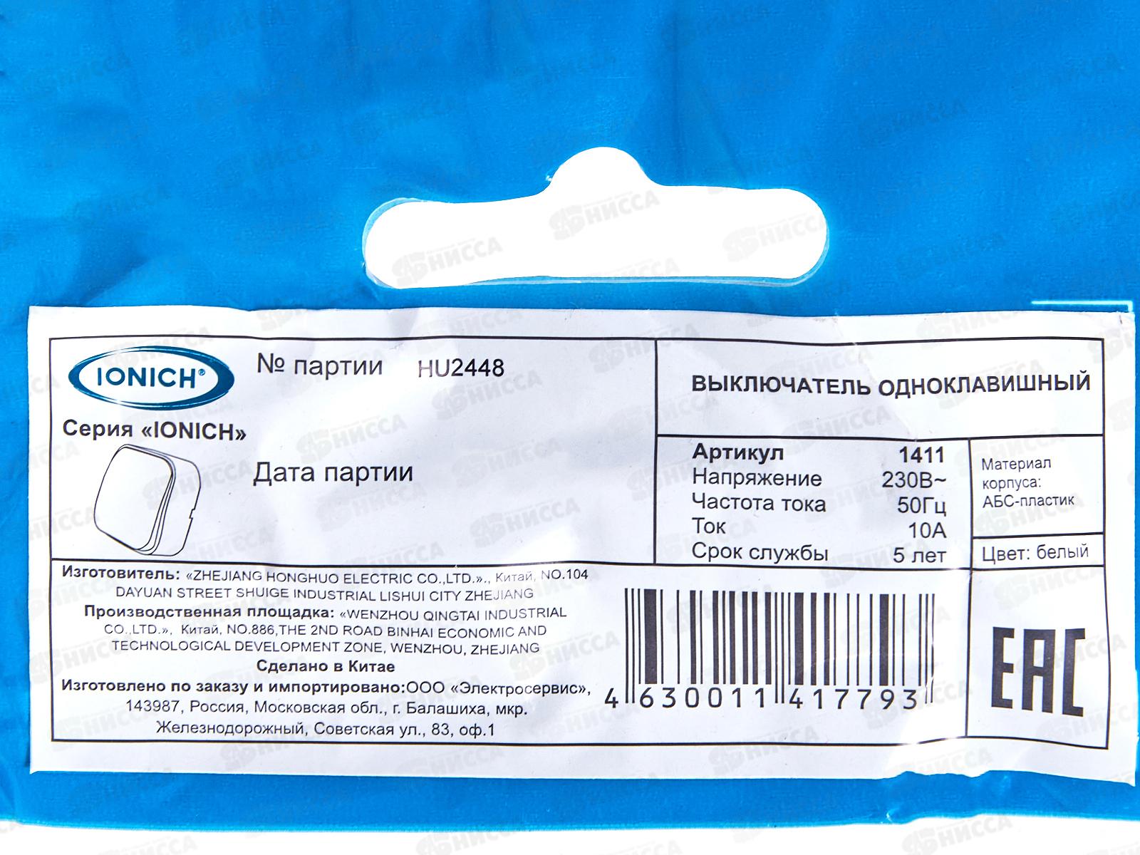 Выключатель IONICH 1-клавиша открытая установка, 10А, 220В белый,1411 *10