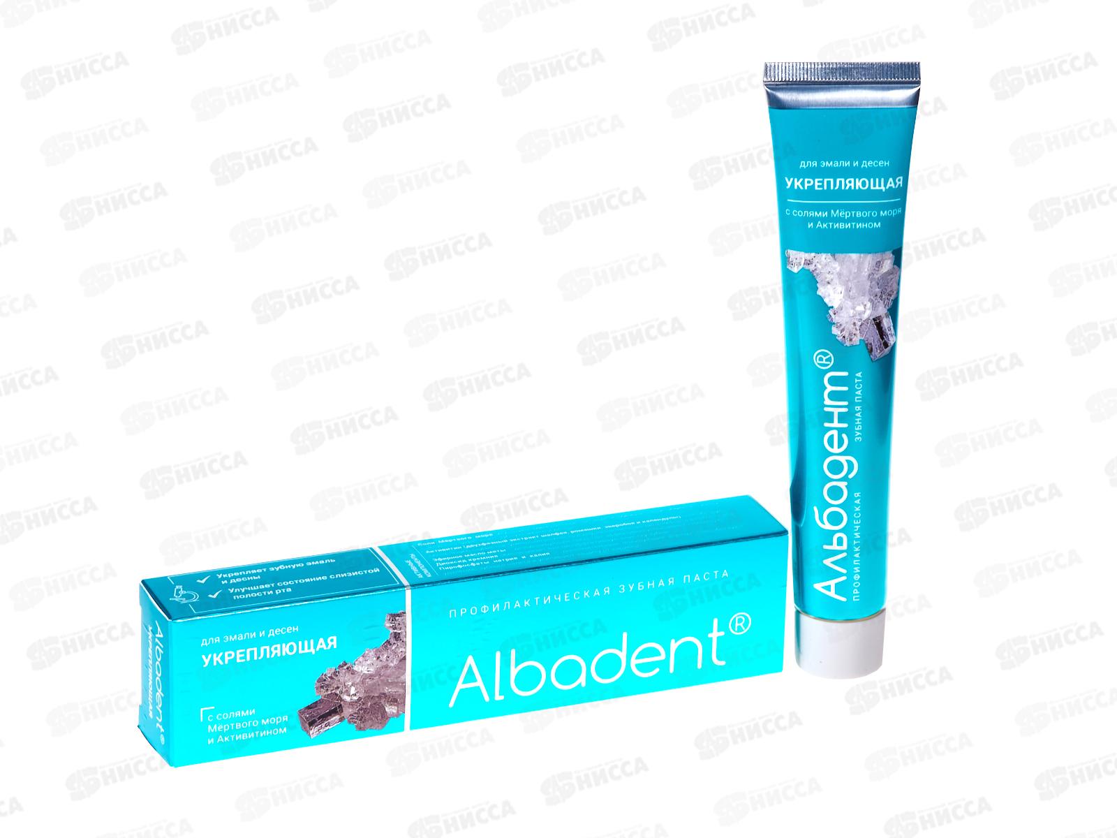 Зубная паста Альбадент Укрепляющая с минералами Мертвого моря реминерализирует и укрепляет зубную эмаль. Активин (двухфазный экстракт шалфея, ромашки, зверобоя и календулы) способствует обновлению слизистой, поддерживает тонус тканей, устраняет отечность, уменьшает воспаление и кровоточивость. Эфирное масло мяты дарит ощущение свежести. Пирофосфат натрия и калия эффективно удаляют налет и усиливают защиту от кариеса. Паста не содержит фтор. Со вкусом мяты без солоноватости. Состав: Вода, Гидратированный диоксид кремния, сорбит, Глицерин, Биофлаволипидный комплекс Activitin® (Экстракт шалфея лекарственного, экстракт ромашки прямостоячей, экстракт зверобоя продырявленного, экстракт календулы лекарственной), Лаурилсульфат натрия, Морская соль (минеральные соли Мертвого моря), Тетракалий пирофосфат, Тетранатриевый пирофосфат, Ксантановая камедь, Диоксид титана, Метилпарабен, Этилпарабен, Пропиленгликоль, ароматизатор, Масло мяты перечной, Сахарин, Лимонен.