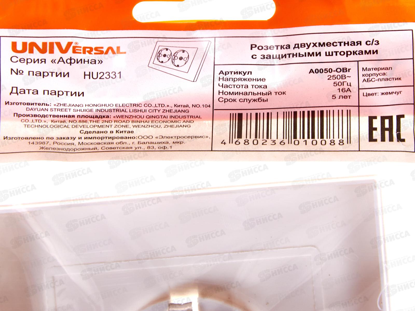 Розетка Афина 2-местная скрытой установки, с заземлением,з/ш 16А, 220В жемчуг, A0050-OBr*10