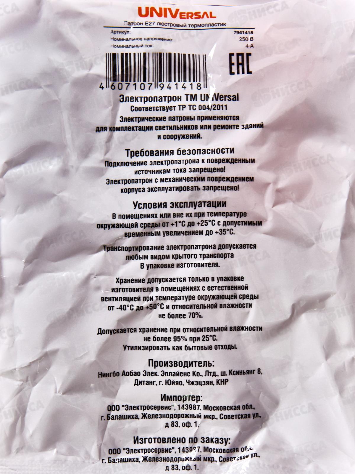 Патрон UNIVersal E27,люстровый термопластик 4А, 250В, инд. упак., 7941418
