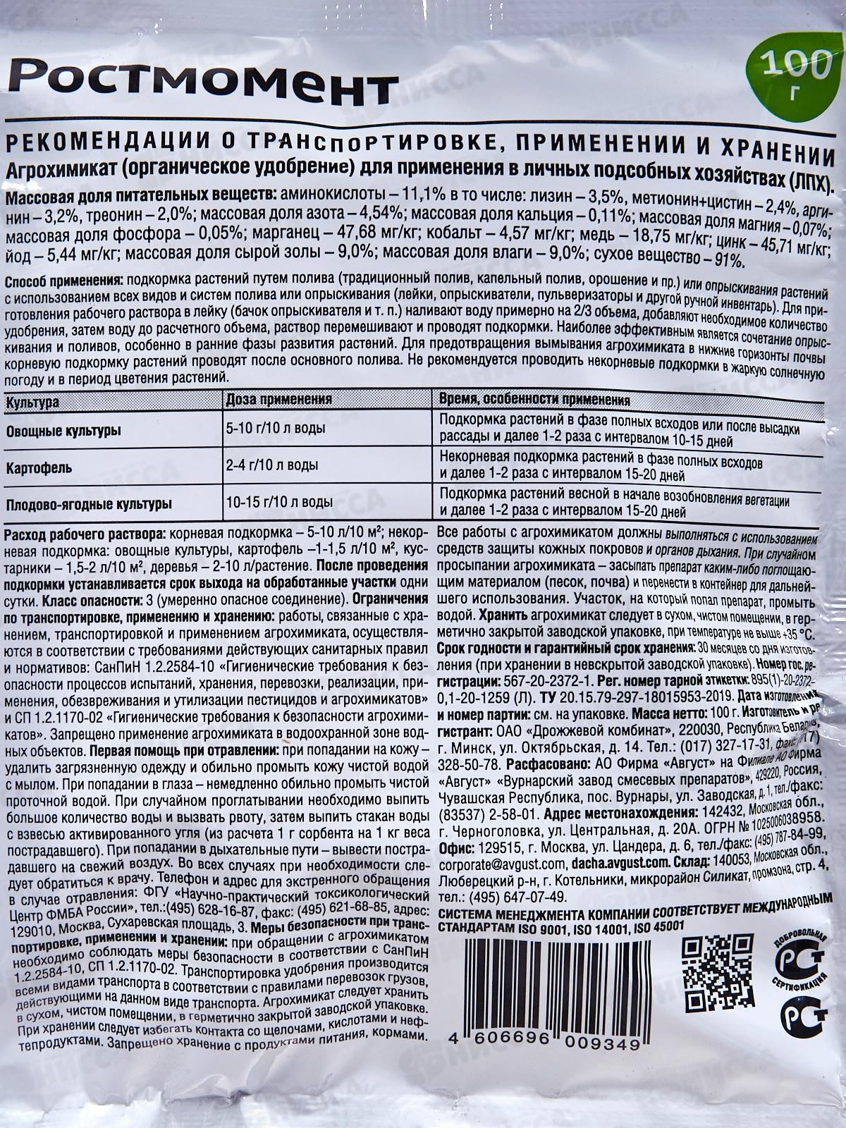 Компоненты: аминокислоты – 11,1%, N – 4,55, P – 0,05%, Mg – 0,07% + микроэлементы