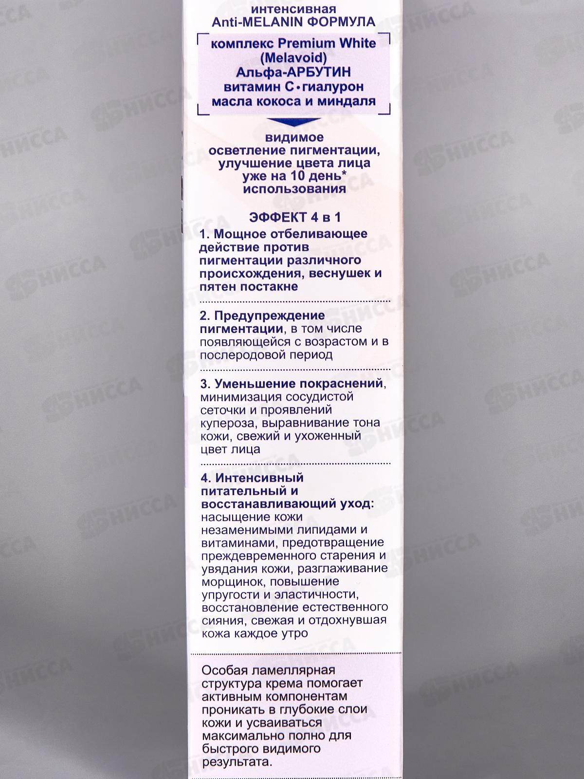Мощное отбеливающее действие против пигментации различного происхождения, веснушек и пятен постакне Предупреждение пигментации, в том числе появляющейся с возрастом и в послеродовой период. Состав: вода, цетеарилглюкозид, сорбитаноливат, цетеариловый спирт, изоамиллаурат, глицерин, гиалуронат натрия, масло Cocos Nucifera (кокосовое), изопропилмиристат, альфа-арбутин, масло Prunus Amygdalus Dulcis (сладкого миндаля), 3-o-этиласкорбиновая кислота, экстракт корня Boerhavia diffusa (пунарнавы), ППГ-15 стеариловый эфир, транексамовая кислота, глицерилтрикаприлат/капрат, воск пчелиный синтетический, полиметилметакрилат, сополимер акрилоилдиметилтаурата аммония и винилпирролидона, феноксиэтанол, метилпарабен, этилпарабен, пропилпарабен, триэтилцитрат, масло зародышей Triticum vulgare (пшеницы), токоферилацетат, БГТ, парфюмерная композиция, стеарилглицирезинат, 2-бром-2-нитропропан-1,3-диол, лимонная кислота, гексилциннамаль, лимонен, линалол.