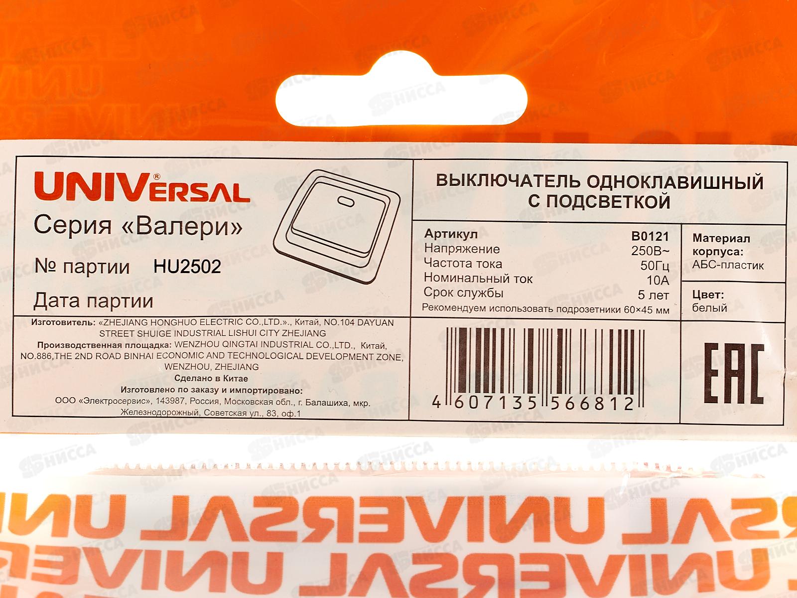 Выключатель Валери 1-клавиша скрытой установки, 10А, 220В, подсветка, белый, В0121*10