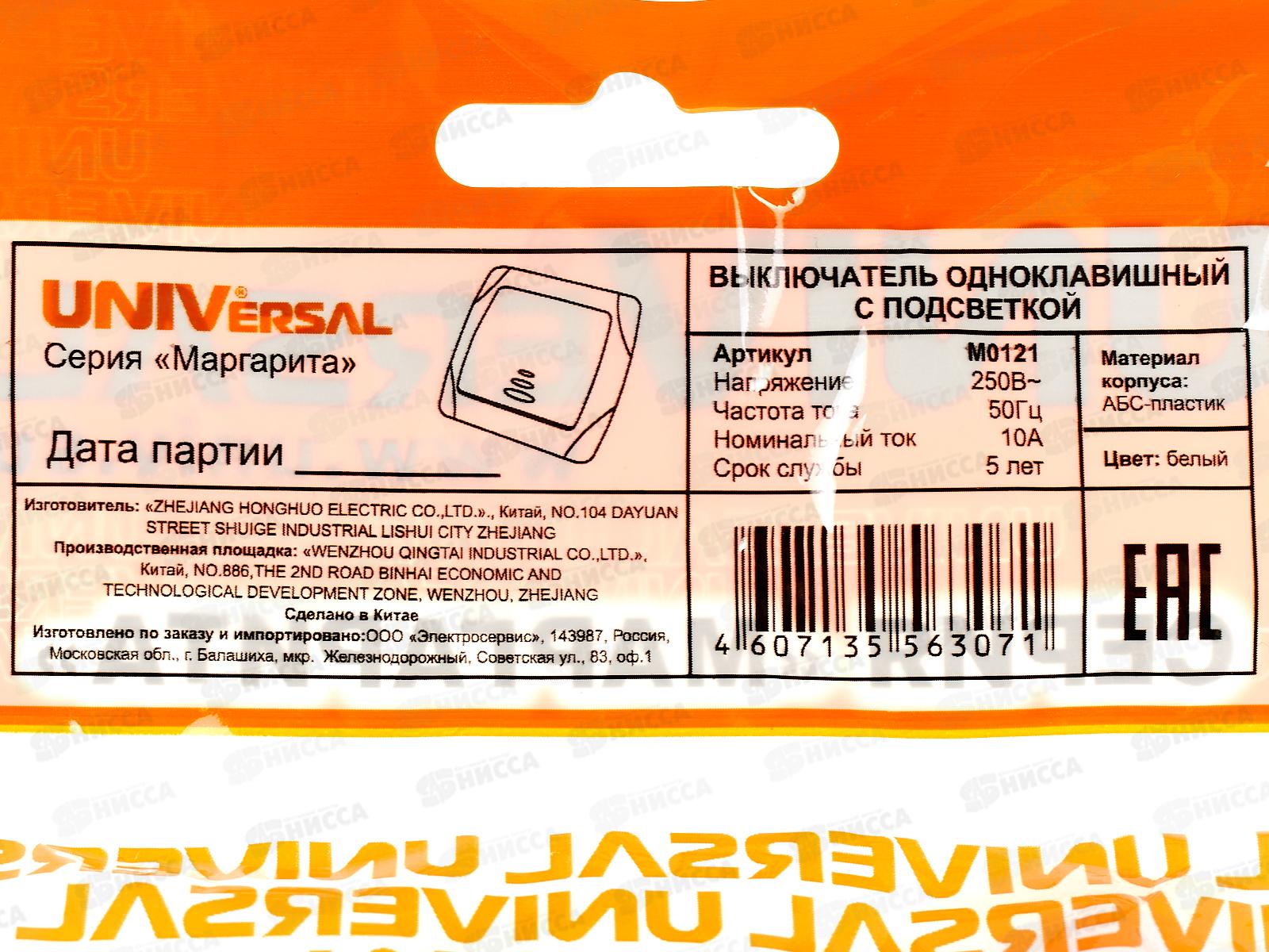 Выключатель Маргарита 1-клавиша скрытой установки, 10А, 220В, подсветка, белый, М0121*10