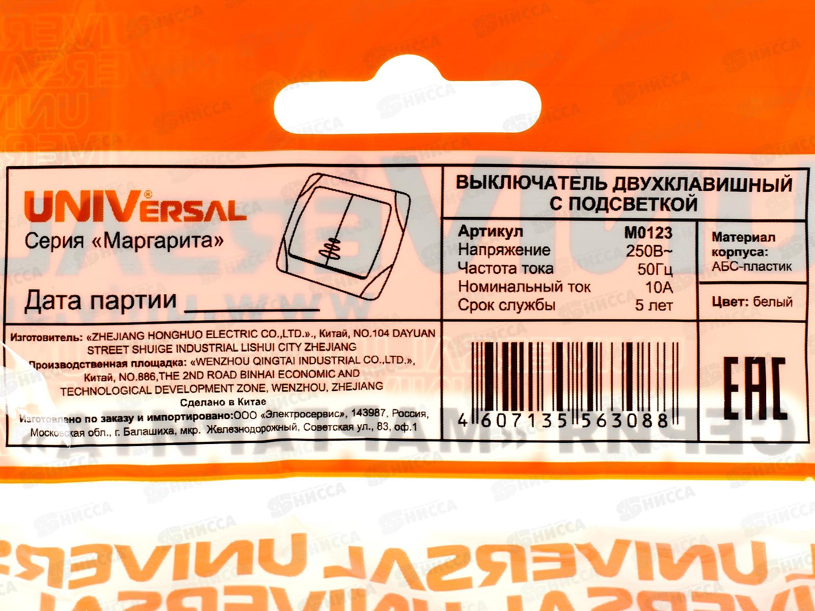 Выключатель Маргарита 2-клавиши скрытой установки, 10А, 220В, подсветка, белый, М0123*10