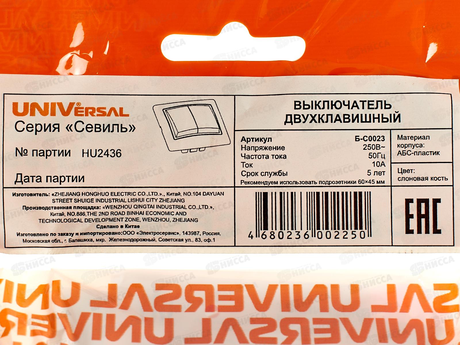 Выключатель Севиль 2-клавиши скрытой установки, 10А, 220В слоновая кость, Б-С0023 *10