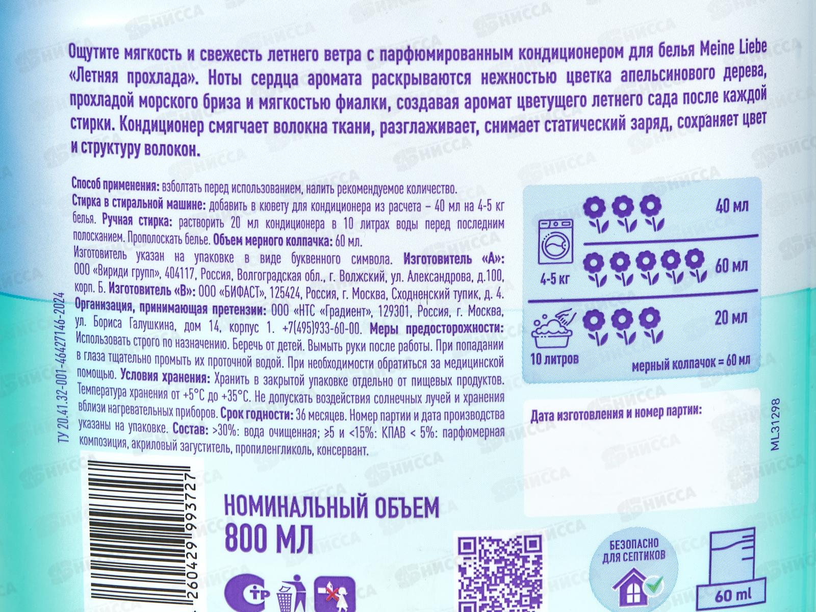 MEINE LIEBE кондиционер Летняя прохлада концентрат 800 ML31297 *6