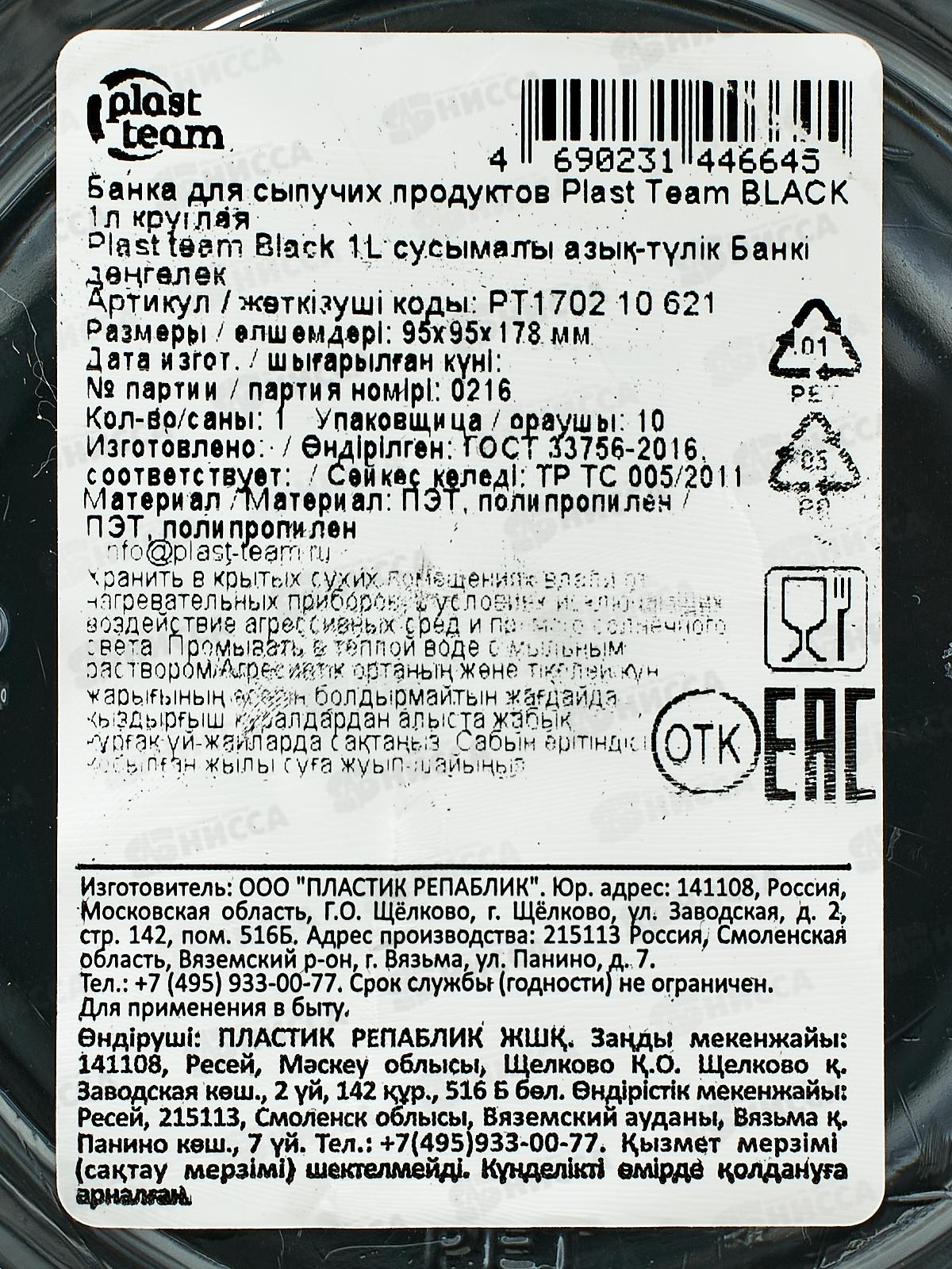 Банка д/сып прод 1л "Plast Team" круглая Блэк РТ170210621 *12