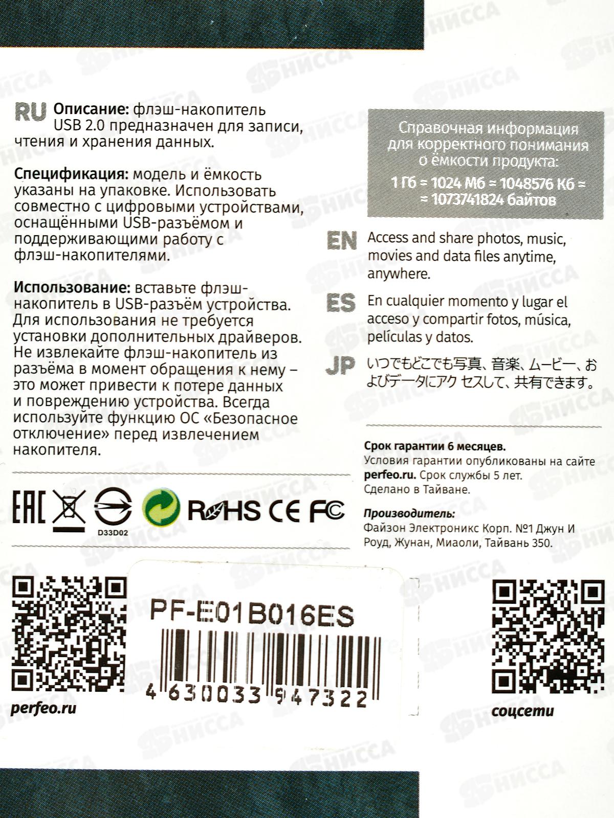 Флеш-карта Perfeo USB 16GB E01 Black economy series, PF-E01B016ES