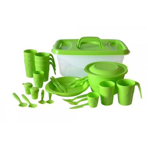 Набор для пикника «Чезаре» помещается в пластиковый контейнер объемом 16л и состоит из 31 предмета: миска с крышкой 3л (1шт), емкости для специй (2шт), тарелки для вторых блюд (4шт), вилки (4шт), ложки (4 шт), ножи (4 шт), стопки (4 шт), стаканы для холодных напитков (4 шт), кружки для горячих напитков (4 шт). Посуда выполнена из качественного пищевого пластика и разрешена для контакта с пищевыми продуктами.