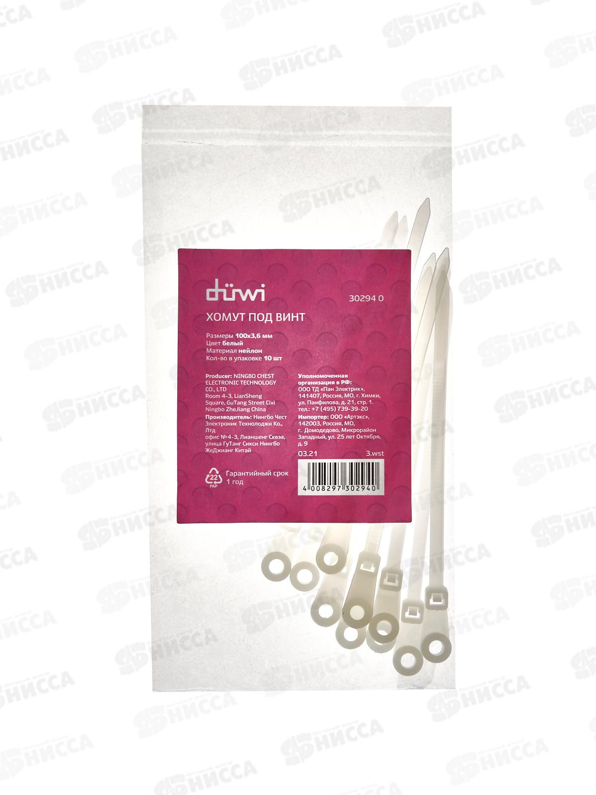 Хомут-стяжка кабельный нейл под винт Diwi 100*3,6мм 10шт белый 30294