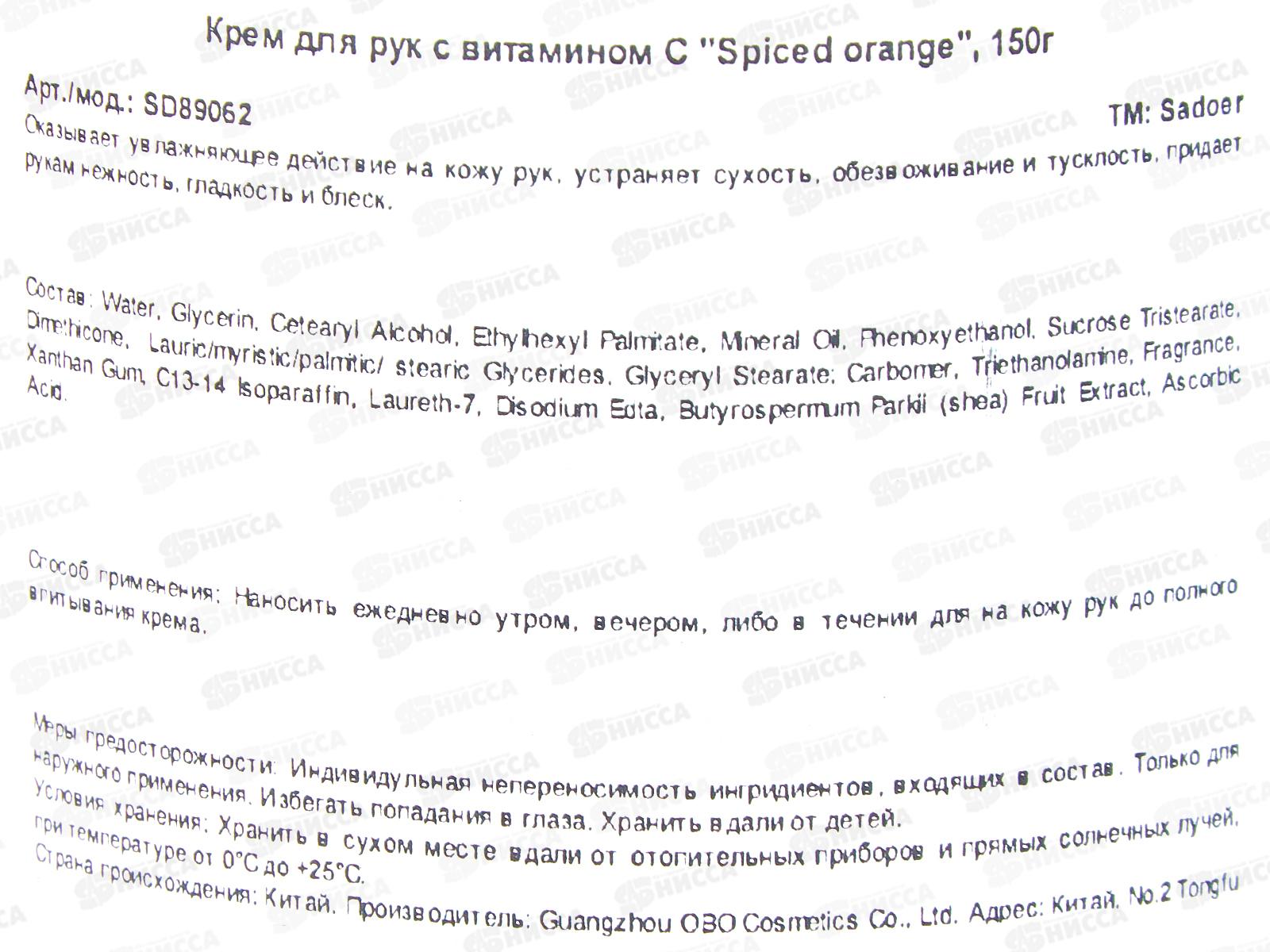 Sadoer Крем для рук Spiced orange с витамином C оказывает увлажняющее действие на кожу рук, устраняет сухость, обезвоживание и тусклость, придает рукам нежность, гладкость и блеск. Состав продукта: Water, Glycerin, Cetearyl Alcohol, Ethylhexyl Palmitate, Mineral Oil, Phenoxyethanol, Sucrose Tristearate, Dimethicone, Lauric/myristic/palmitic/ stearic Glycerides, Glyceryl Stearate; Carbomer, Triethanolamine, Fragrance, Xanthan Gum, C13-14 Isoparaffin, Laureth-7, Disodium Edta, Butyrospermum Parkii (shea) Fruit Extract, Ascorbic Acid.