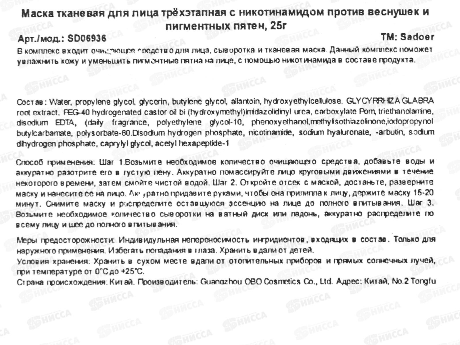 OBO Sadoer Маска для лица тканевая трехэтапн. п/пигмент кожи никот 25г