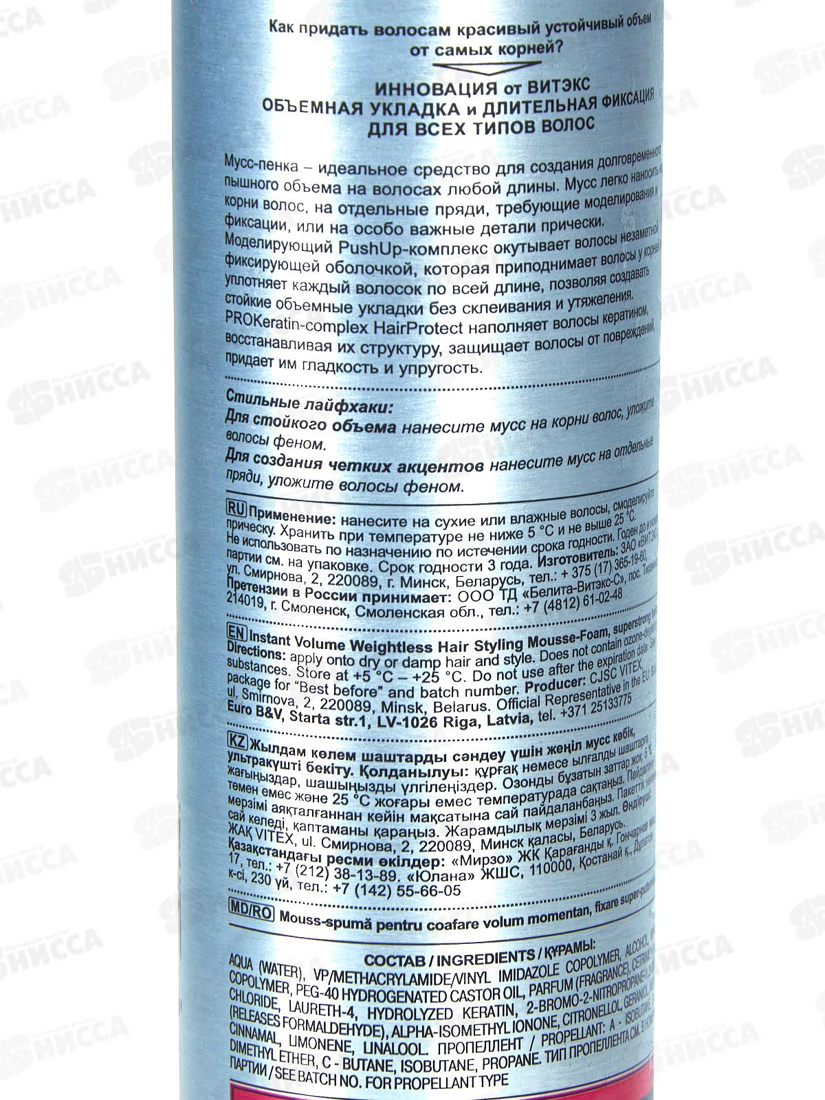 Мусс-пенка – идеальное средство для создания долговременного пышного объема на волосах любой длины. Мусс легко наносить на корни волос, на отдельные пряди, требующие моделирования и фиксации, или на особо важные детали прически. Состав: Вода, лауретсульфат натрия, кокамидопропилбетаин, кокоамфодиацетат динатрия, хлорид натрия, кокамид MIPA, лаурет-4, лауроилсаркозинат натрия, ПЭГ-3 дистеарат, парфюмерная композиция, поликватерниум-10, лимонная кислота, ЭДТА динатрия, бензиловый спирт, метилхлоризотиазолинон, метилизотиазолинон, экстракт Chamomilla Recutita (ромашки), сок листьев Aloe barbadensis (алоэ).