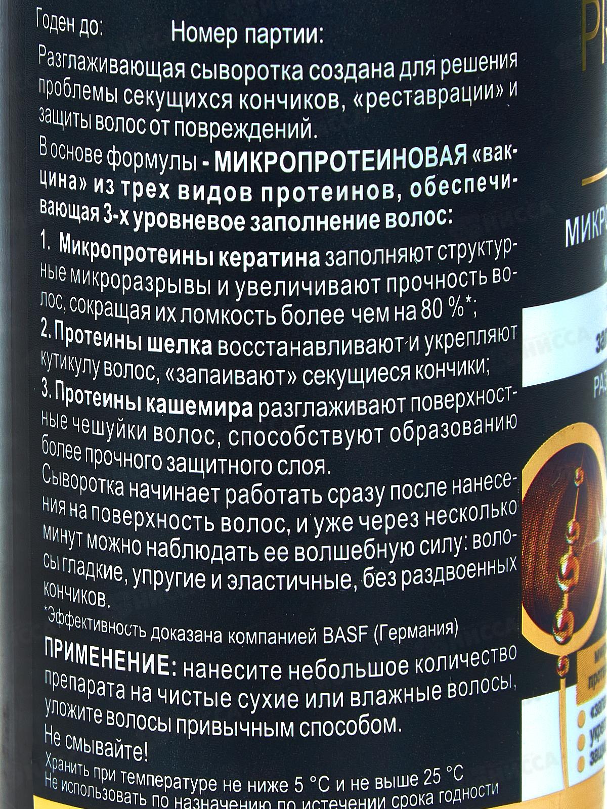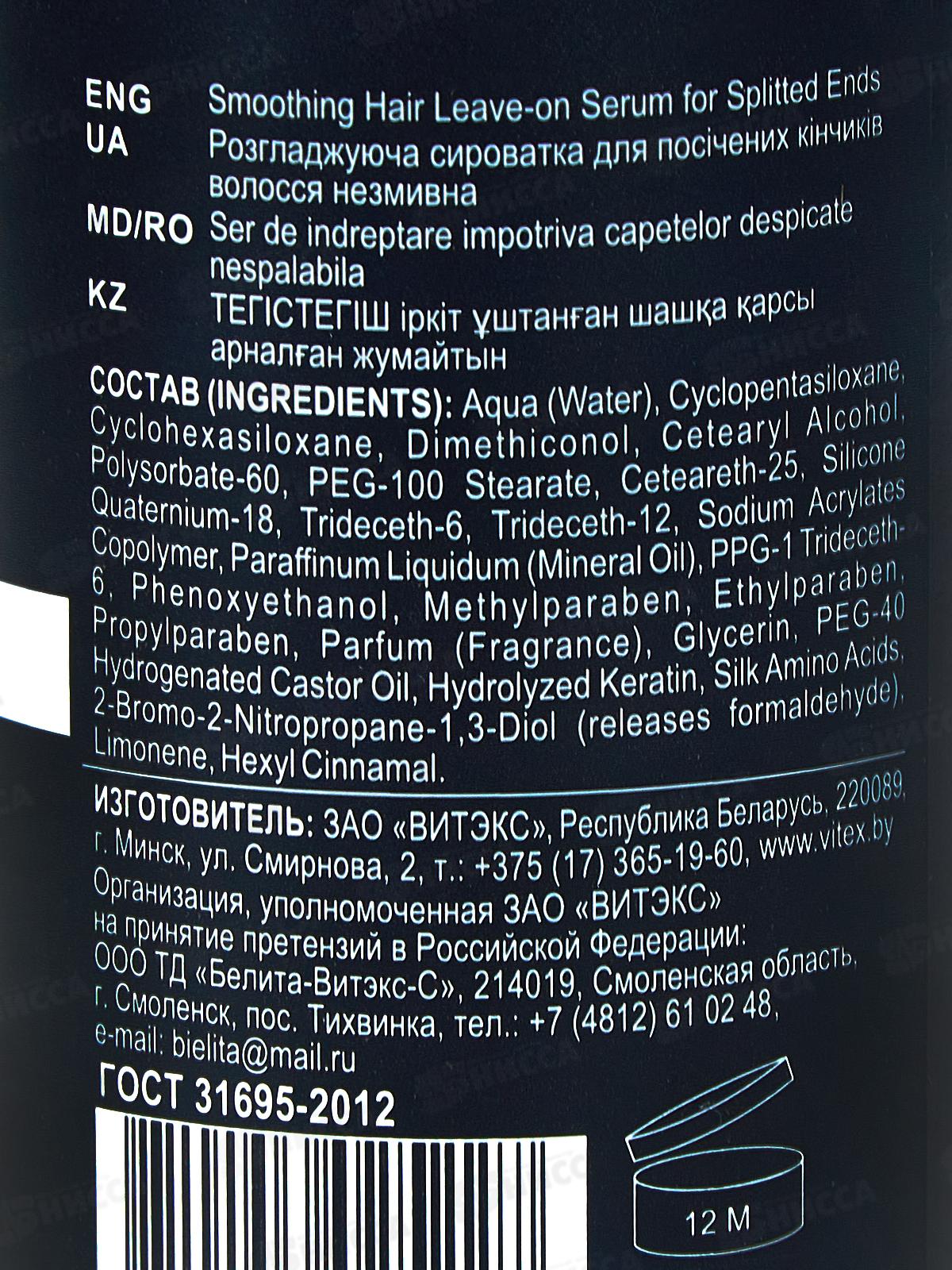 Разглаживающая сыворотка создана для решения проблемы секущихся кончиков, их «реставрации» и защиты от повреждений. МИКРОПРОТЕИНОВАЯ «вакцина» восстанавливает и укрепляет кутикулу волос, «запаивает» секущиеся кончики. Состав: вода, циклопентасилоксан, циклогексасилоксан, циклотетрасилоксан, диметиконол, цетеариловый спирт, полисорбат-60, ПЭГ-100 стеарат, цетеарет-25, силикон кватерниум-18, тридецет-6, тридецет-12, сополимер акрилатов натрия, вазелиновое масло, ППГ-1 тридецет-6, феноксиэтанол, метилпарабен, этилпарабен, пропилпарабен, парфюмерная композиция, глицерин, ПЭГ-40 гидрогенизированное касторовое масло, гидролизованный кератин, аминокислоты шелка, 2-бром-2-нитропропан-1,3-диол, лимонен, гексилциннамаль.