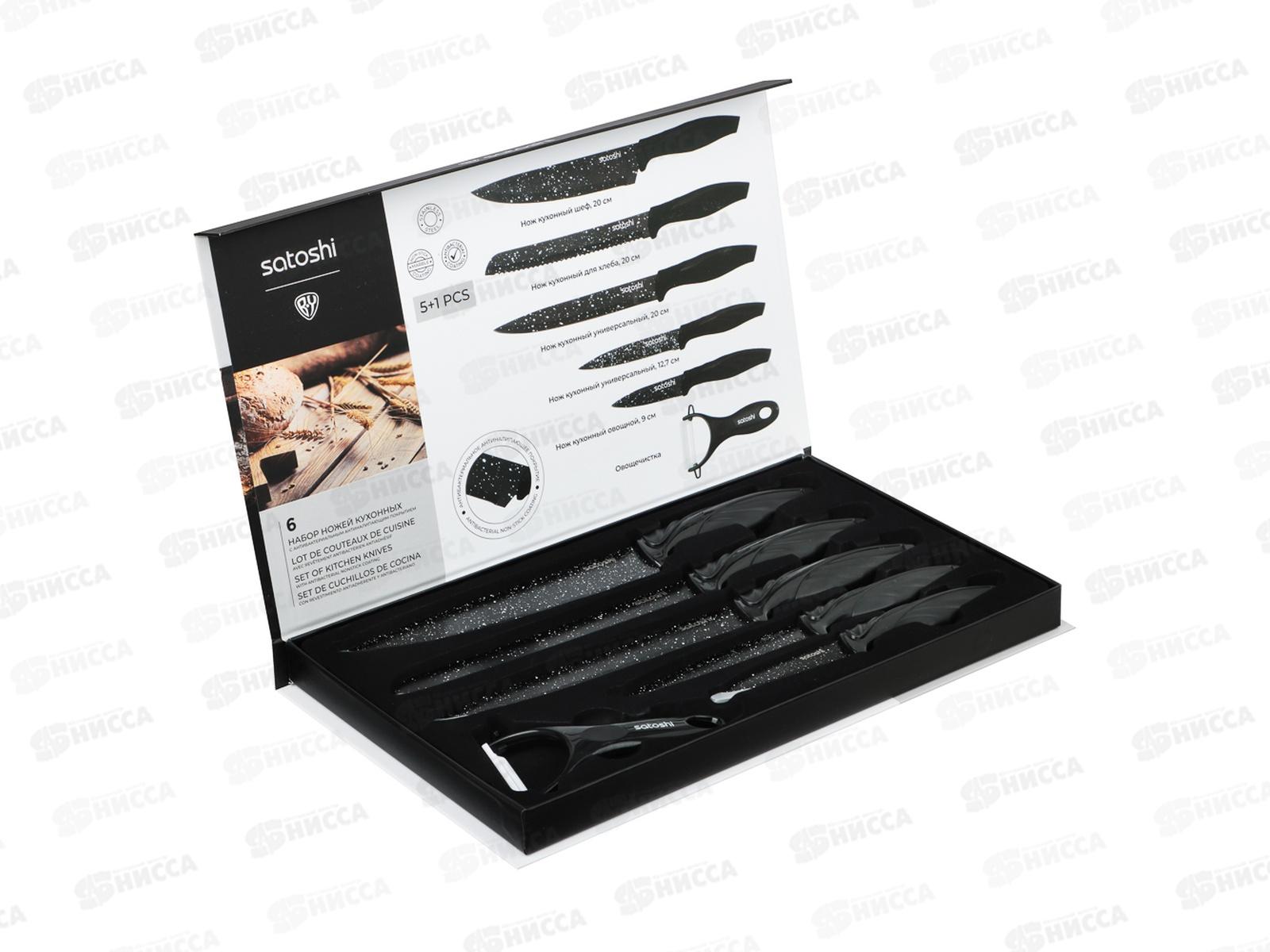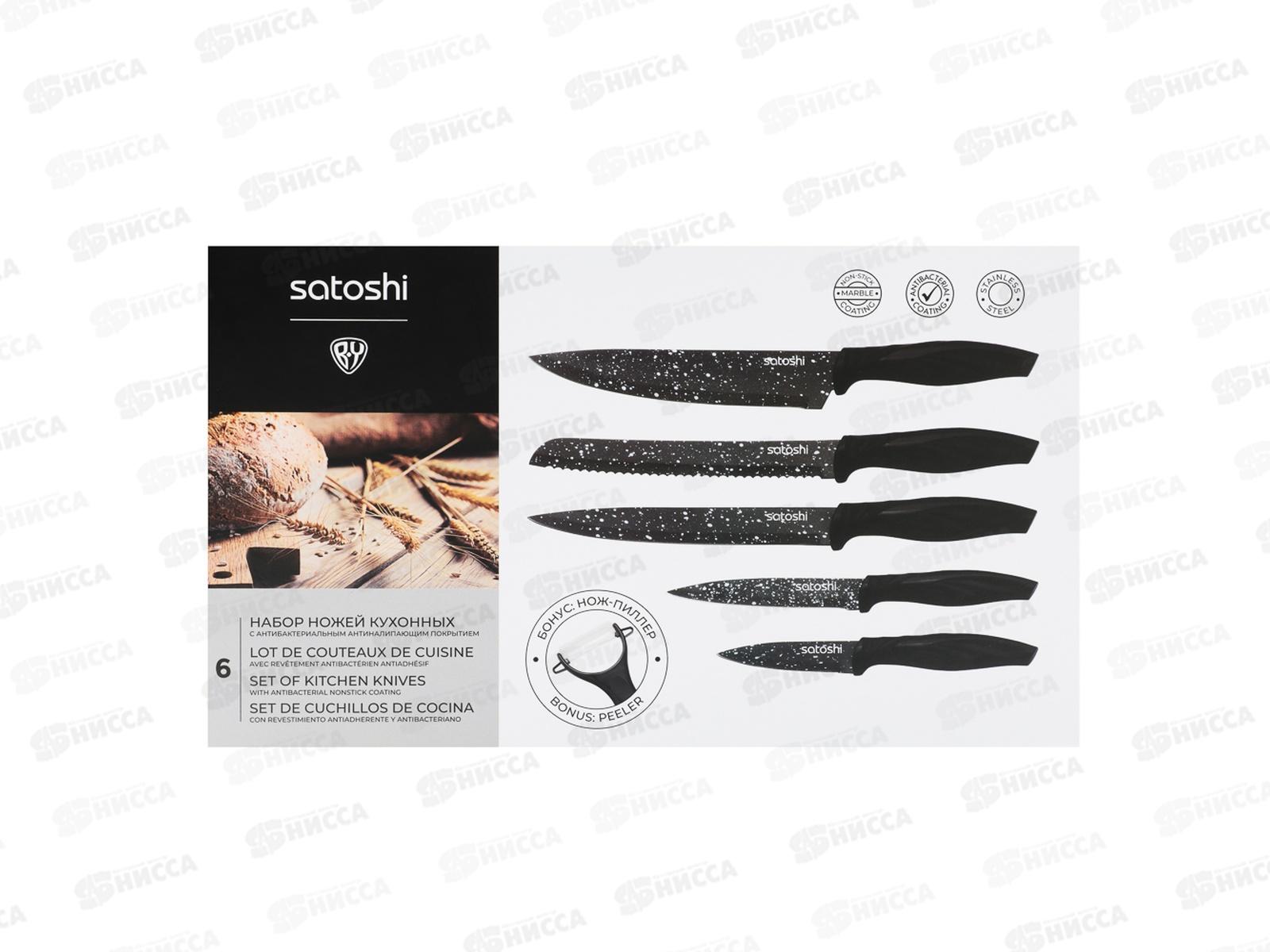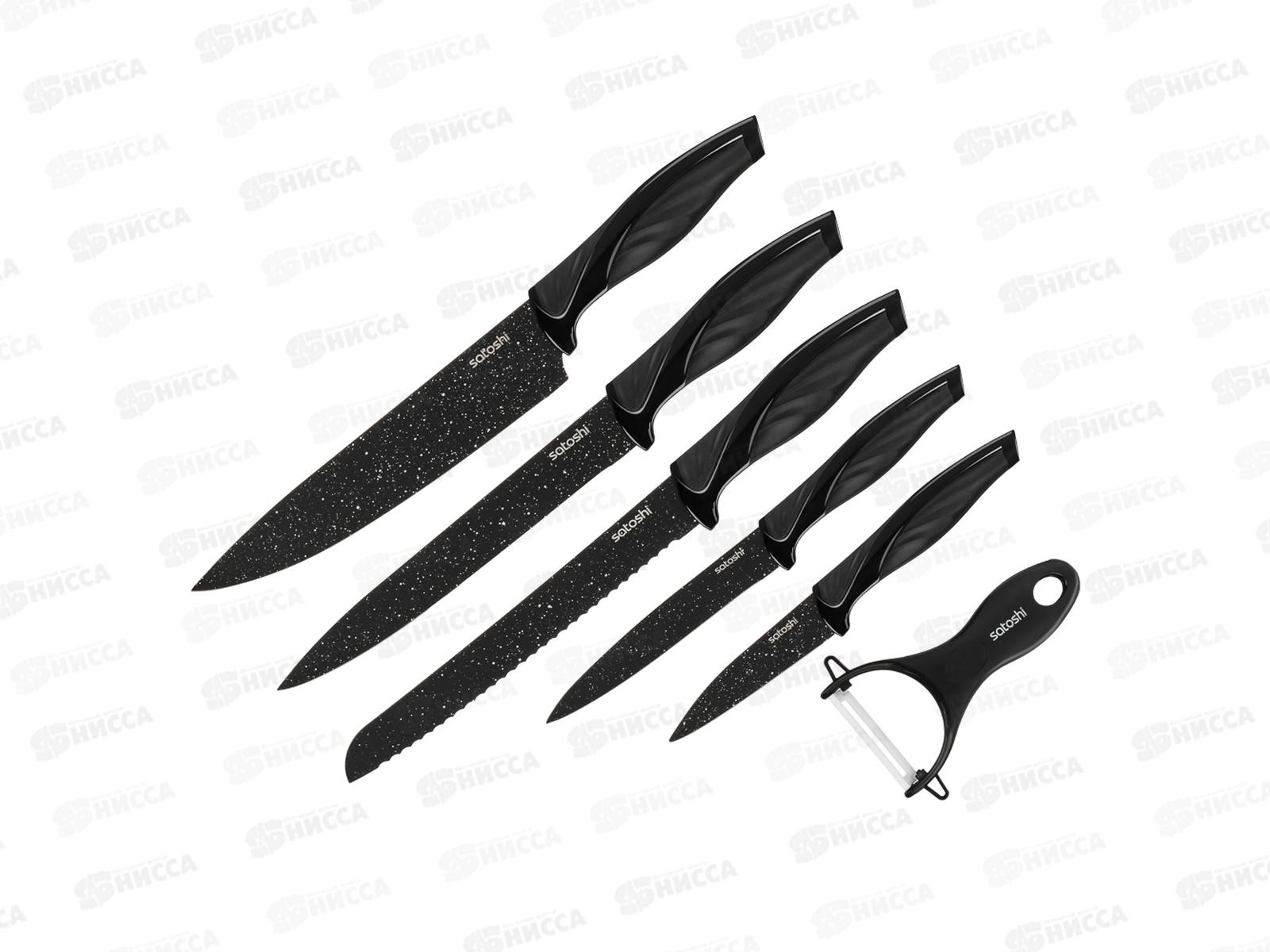 Набор кухонных ножей SATOSHI Мунстер из 6 предметов – это отличное решение для домашней кухни. Нож-шеф с длиной клинка 20 см удобен для быстрой нарезки овощей, зелени и фруктов. Универсальные ножи 20 см и 12,7 см справятся с чисткой овощей и разделкой мяса и рыбы. Маленький нож 9 см удобен для вскрытия упаковок, мелких нарезок и чистки продуктов от кожуры. Хлебный нож 20 см позволит нарезать хлебобулочные изделия на идеальные ломтики без образования крошек. Нож-пиллер с горизонтальным лезвием из нержавеющей стали предназначен для очистки овощей и фруктов. Тонко снимает кожуру с картофеля, яблок, свеклы, моркови. Может также использоваться для нарезания тончайших ломтиков овощей, например, огурцов для создания эффектного декора для сервировки блюд. Рукояти имеют эргономичную форму, крепкие, легко моются и не впитывают неприятные запахи. Лезвия из нержавеющей стали не подвержены коррозии, хорошо держат заточку. Стильный строгий дизайн набора украсит интерьер любой кухни.