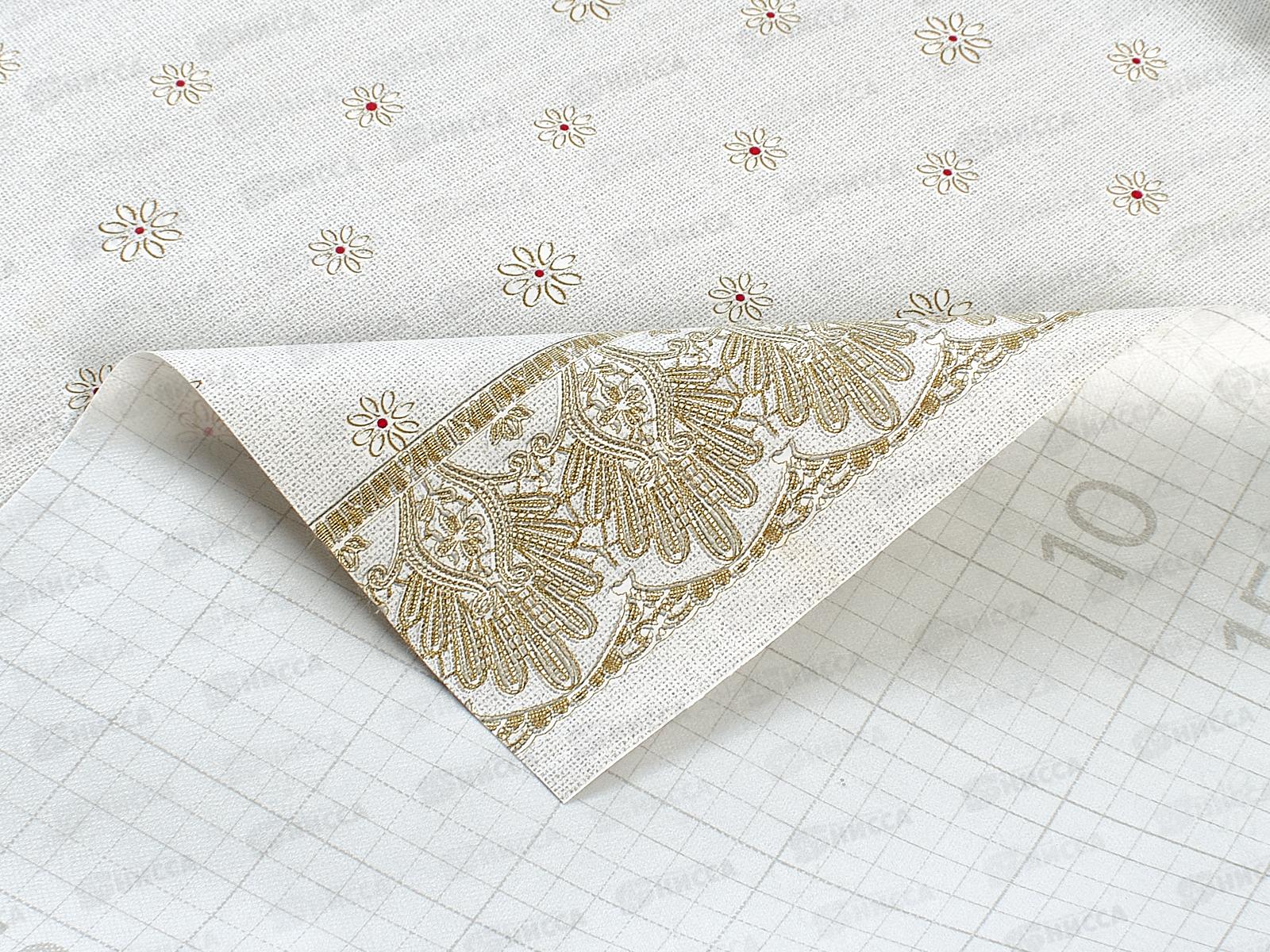 Поверхность клеенки полуматовая, гладкая. На основу нанесена разметка для удобства отмеривания и нарезания клеенки.