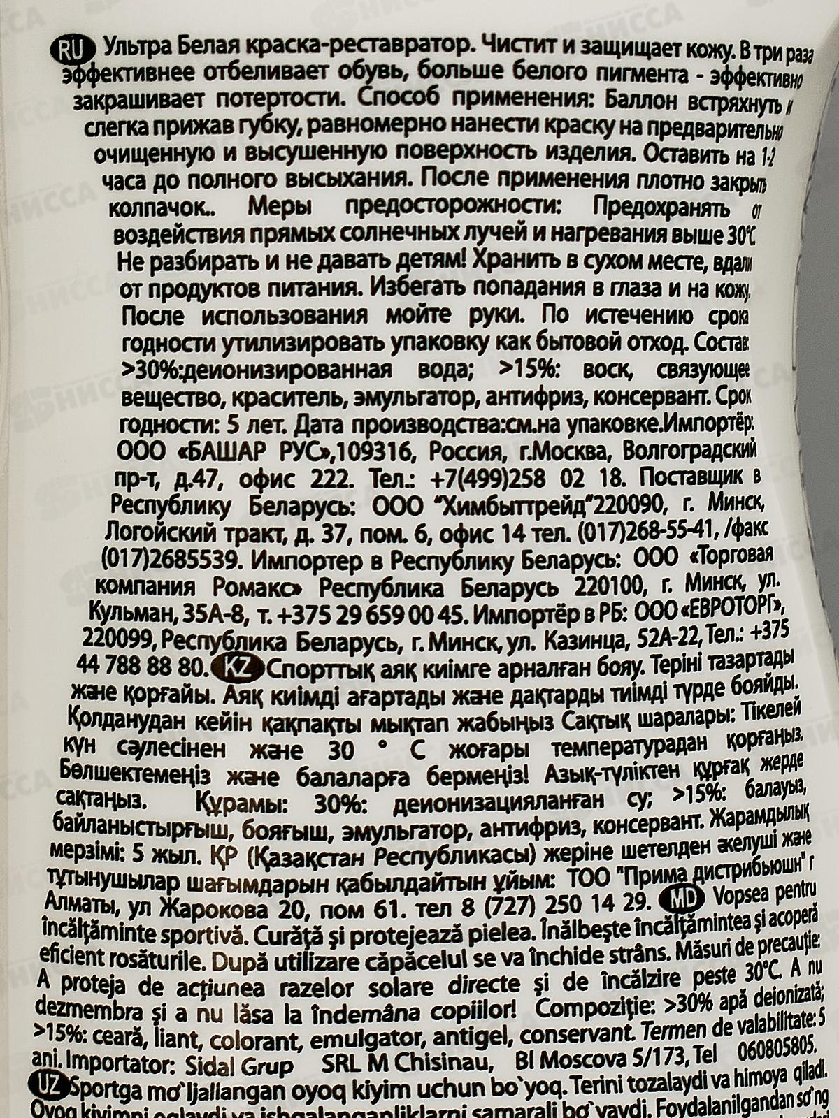 Состав: деионизированная вода, воск, связующее вещество, краситель, эмульгатор, антифриз, консервант.
