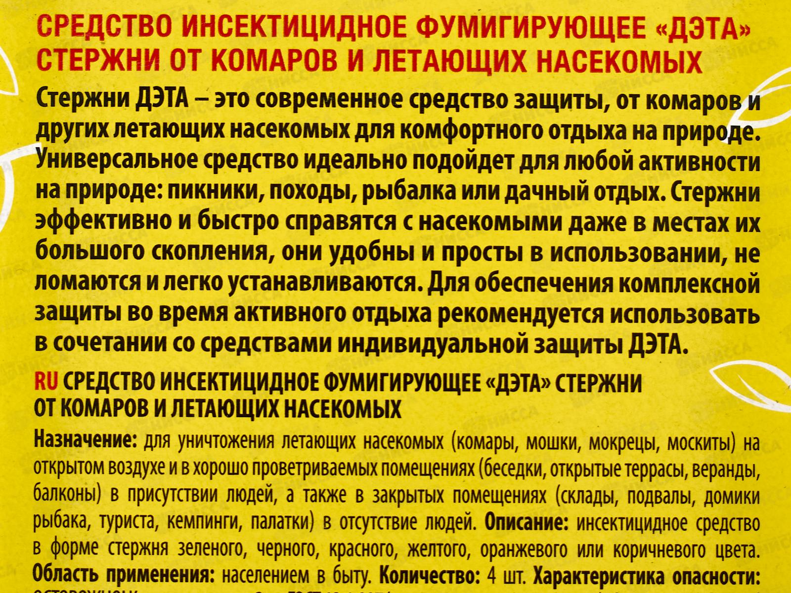 Стрежни от комаров и летающих насекомых ДЭТА эффективно уничтожают комаров, мошек, мокрецов, москитов в местах их большого скопления. Стержни ДЭТА начинают действовать уже через 1 — 2 мин после поджигания и уничтожают насекомых за 10 — 15 мин. Площадь защиты — 25 кв.м. Стержни ДЭТА позволят отлично провести Ваши любимые активности на открытом воздухе, веранде, а также внутри помещений.Состав: d-аллетрин, краситель, крахмал, консервант, древесная мука.