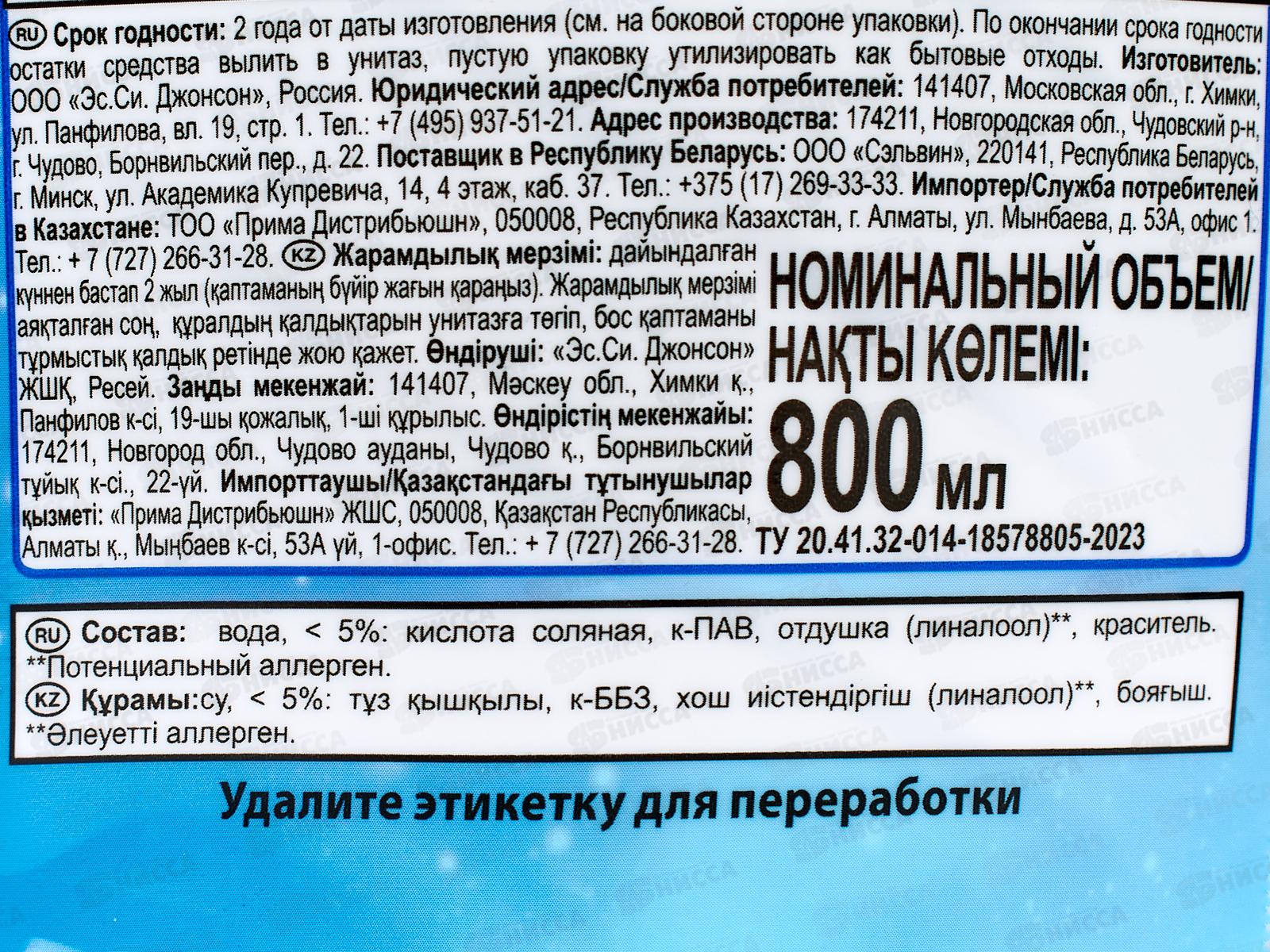 Состав: вода, <5%: кислота соляная, к-ПАВ, отдушка (линалоол), краситель