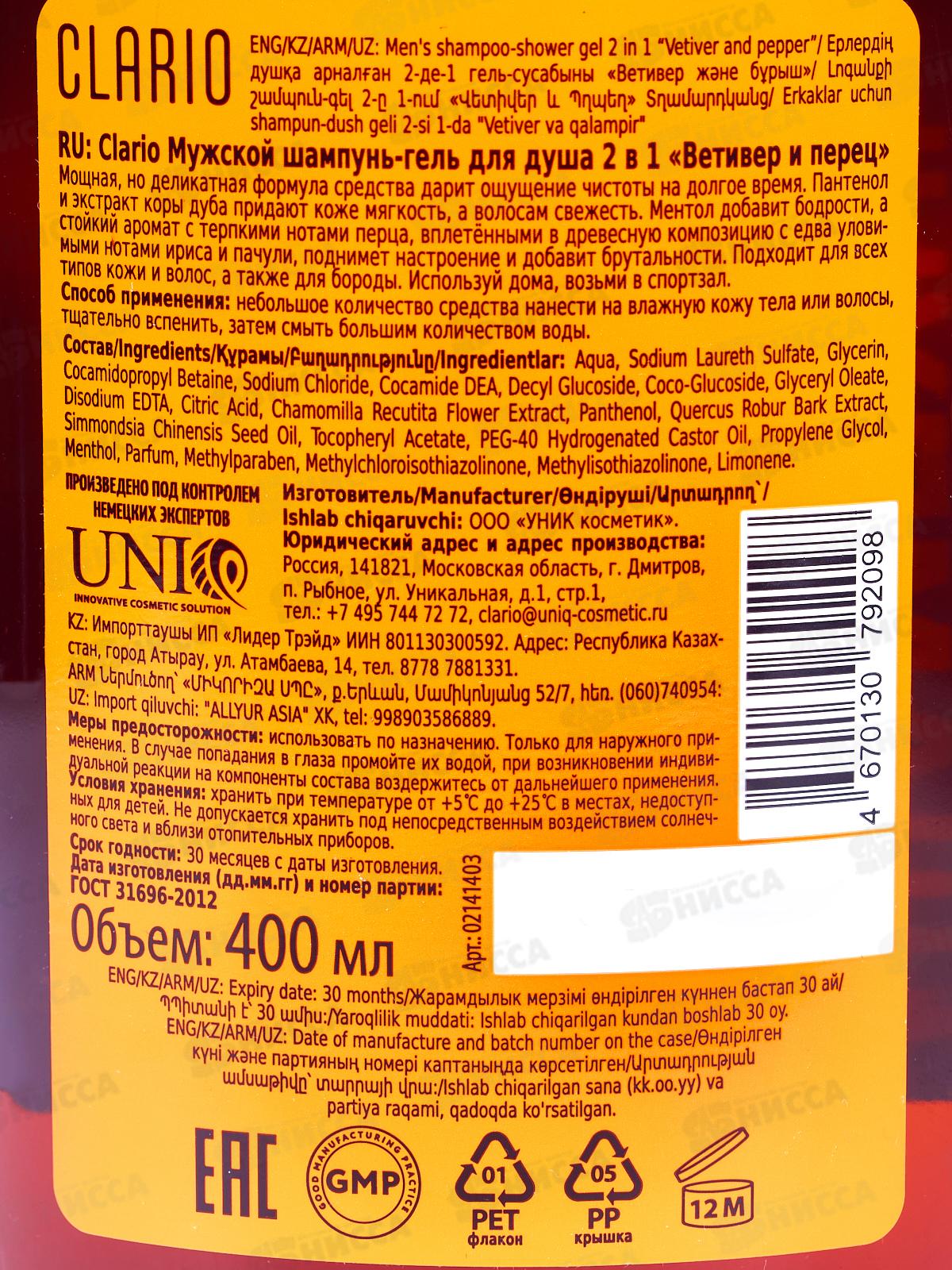 Clario Мужской шампунь-гель для душа 2в1 Ветивер и перец 400мл *5