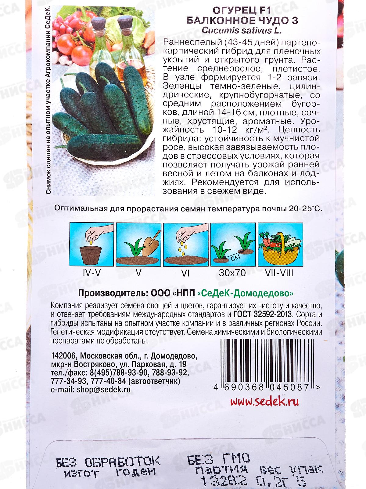Раннеспелый (43-45 дней) партенокарпический гибрид для пленочных укрытий и открытого грунта. Растение среднерослое, плетистое. В узле формируется 1-2 завязи. Зеленцы темно-зеленые, цилиндрические, крупнобугорчатые, со средним расположением бугорков, длиной 14-16 см, плотные, сочные, хрустящие, ароматные. Урожайность 10-12 кг/м2. Ценность гибрида: устойчивость к мучнистой росе, высокая завязываемость плодов в стрессовых условиях, которая позволяет получать урожай ранней весной и летом на балконах и лоджиях. Рекомендуется для использования в свежем виде.
