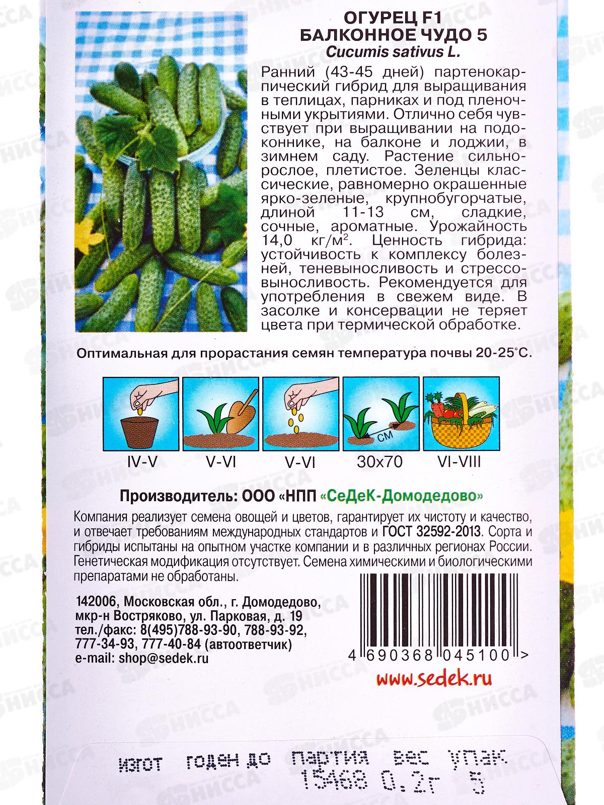 Ранний (43-45 дней) партенокарпический гибрид для выращивания в теплицах, парниках и под пленочными укрытиями. Отлично себя чувствует при выращивании на подоконнике, на балконе и лоджии, в зимнем саду. Растение сильнорослое, плетистое. Зеленцы классические, равномерно окрашенные ярко-зеленые, крупнобугорчатые, длиной 11-13 см, сладкие, сочные, ароматные. Урожайность 14,0 кг/м2. Ценность гибрида: устойчивость к комплексу болезней, теневыносливость и стрессовыносливость. Рекомендуется для употребления в свежем виде. В засолке и консервации не теряет цвета при термической обработке.