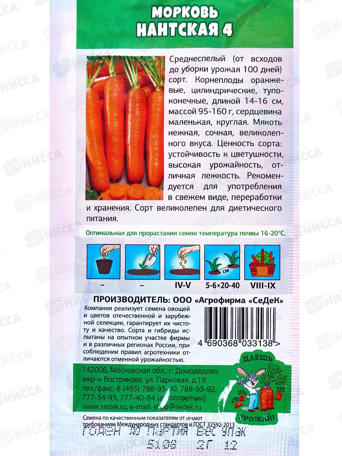 Среднеспелый (от всходов до уборки урожая 100 дней) сорт. Корнеплоды оранжевые, цилиндрические, тупоконечные, длиной 14-16 см, массой 95-160 г, сердцевина маленькая, круглая. Мякоть нежная, сочная, великолепного вкуса. Ценность сорта: устойчивость к цветушности, высокая урожайность, отличная лежкость. Рекомендуется для употребления в свежем виде, переработки и хранения. Сорт великолепен для диетического питания.