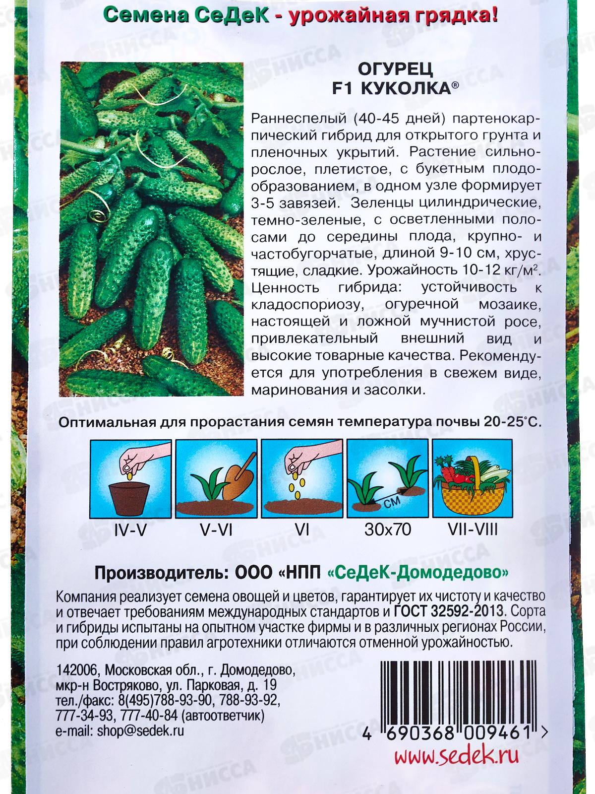Раннеспелый (40-45 дней) партенокарпический гибрид для открытого грунта и пленочных укрытий. Растение сильнорослое, плетистое, с букетным плодообразованием, в одном узле формирует 3-5 завязей. Зеленцы цилиндрические, темно-зеленые, с осветленными полосами до середины плода, крупно- и частобугорчатые, длиной 9-10 см, хрустящие, сладкие. Урожайность 10-12 кг/м2. Ценность гибрида: устойчивость к кладоспориозу, огуречной мозаике, настоящей и ложной мучнистой росе, привлекательный внешний вид и высокие товарные качества. Рекомендуется для употребления в свежем виде, маринования и засолки.
