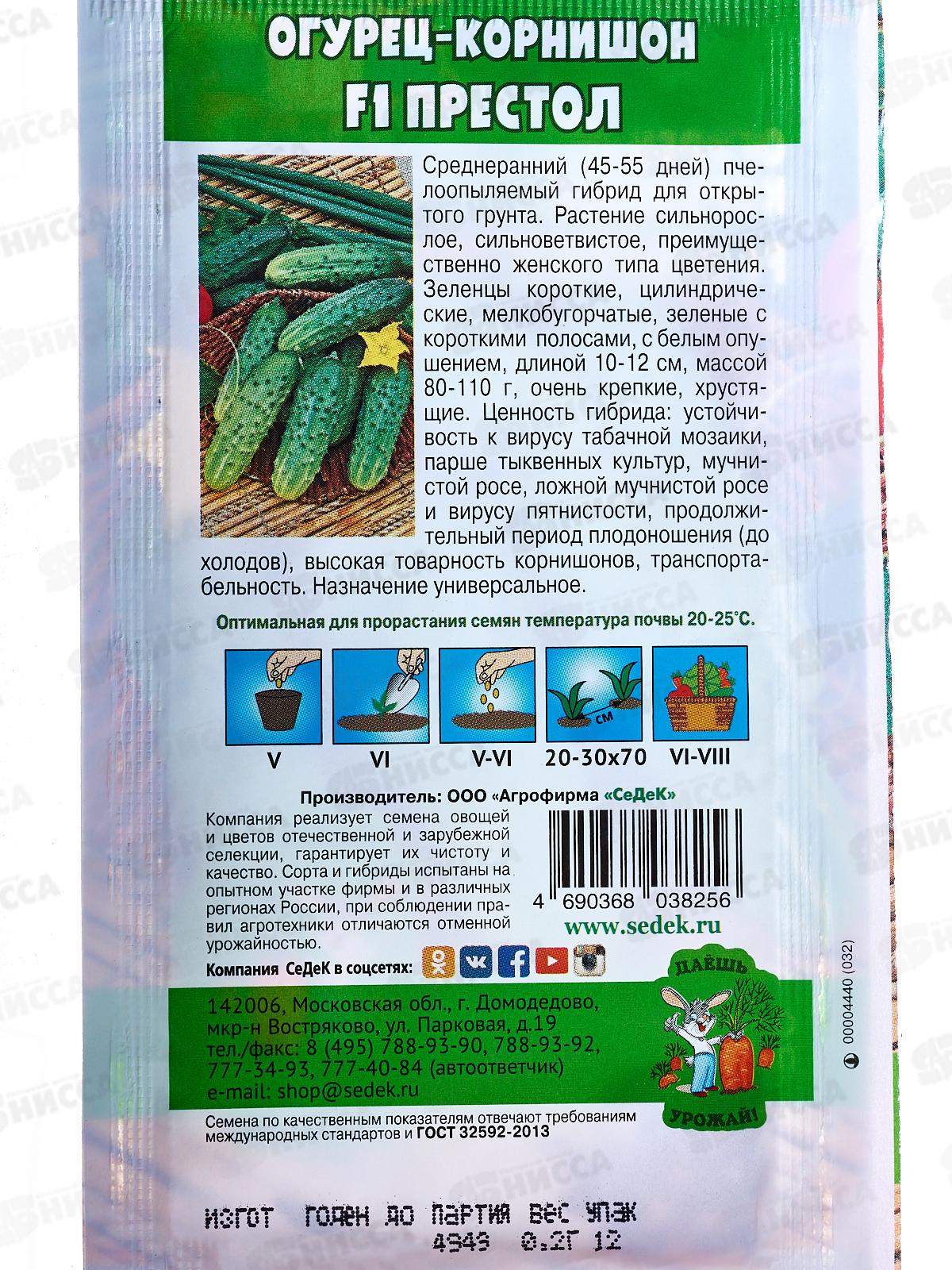 Среднеранний (45-55 дней) пчелоопыляемый гибрид для открытого грунта. Растение сильнорослое, сильноветвистое, преимущественно женского типа цветения. Зеленцы короткие, цилиндрические, мелкобугорчатые, зеленые с короткими полосами, с белым опушением, длиной 10-12 см, массой 80-110 г, очень крепкие, хрустящие. Ценность гибрида: устойчивость к вирусу табачной мозаики, парше тыквенных культур, мучнистой росе, ложной мучнистой росе и вирусу пятнистости, продолжительный период плодоношения (до холодов), высокая товарность корнишонов, транспортабельность. Назначение универсальное.