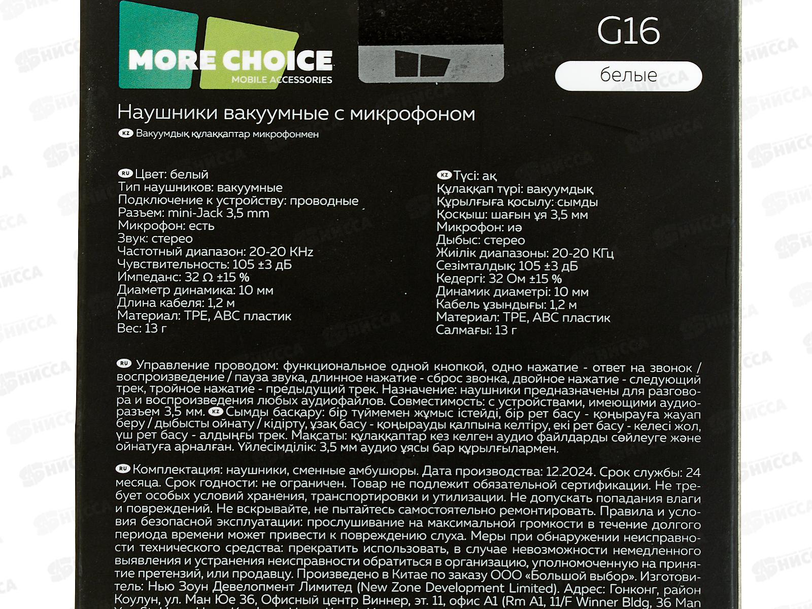 Наушники вакуумные AUX разъём с МК 1.2м, More Choice G16 белый