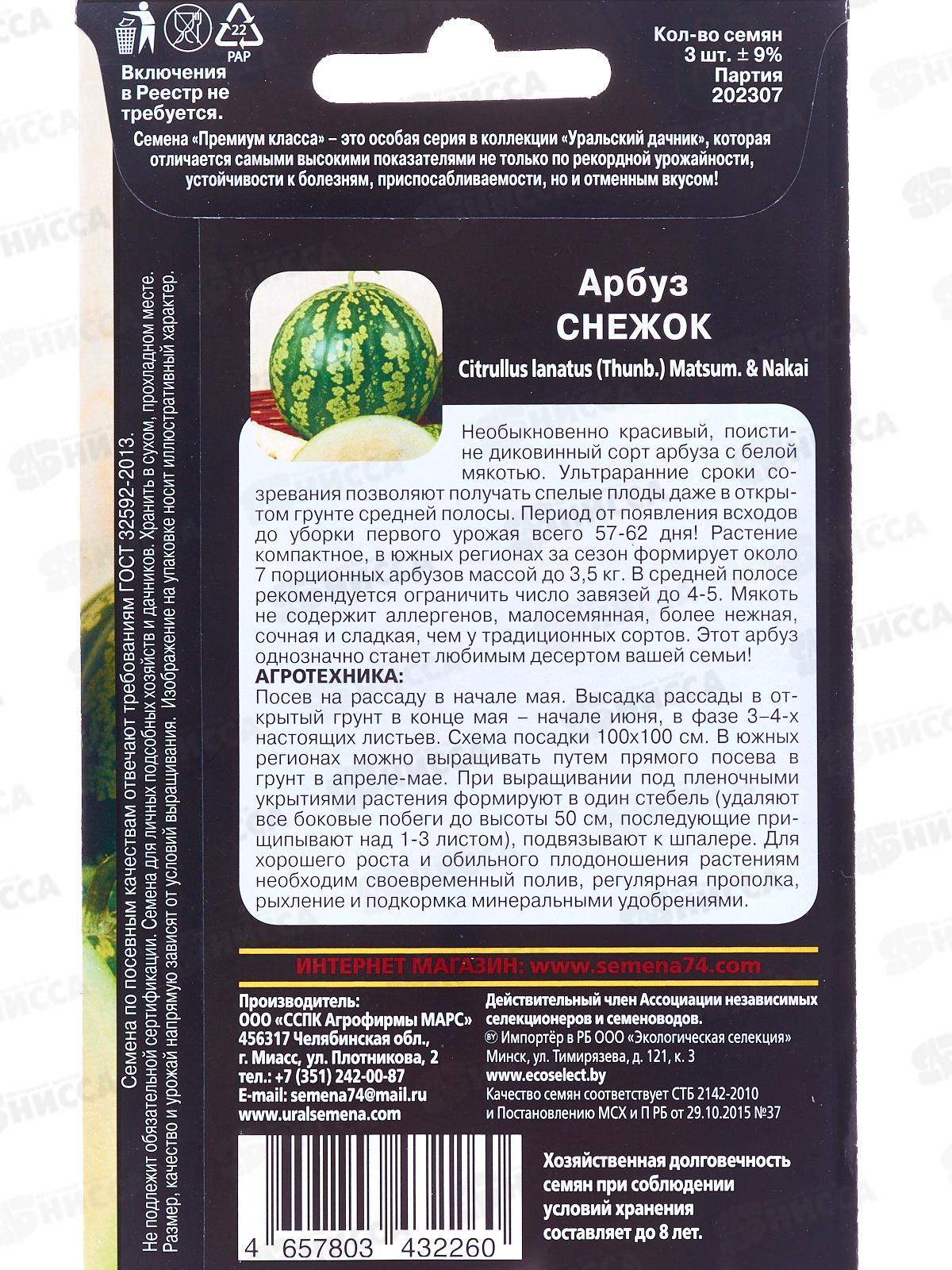 Необыкновенно красивый, поистине диковинный сорт арбуза с белой мякотью. Ультраранние сроки созревания позволяют получать спелые плоды даже в открытом грунте средней полосы. Период от появления всходов до уборки первого урожая всего 57-62 дня! Растение компактное, в южных регионах за сезон формирует около 7 порционных арбузов массой до 3,5 кг. В средней полосе рекомендуется ограничить число завязей до 4-5. Мякоть не содержит аллергенов, малосемянная, более нежная, сочная и сладкая, чем у традиционных сортов. Этот арбуз однозначно станет любимым десертом вашей семьи! Посев на рассаду в начале мая. Высадка рассады в открытый грунт в конце мая – начале июня, в фазе 3–4-х настоящих листьев. Схема посадки 100 х 100 см. В южных регионах можно выращивать путем прямого посева в грунт в апреле – мае. При выращивании под пленочными укрытиями растения формируют в один стебель (удаляют все боковые побеги до высоты 50 см, последующие прищипывают над 1-3 листом), подвязывают к шпалере. Для хорошего роста и обильного плодоношения растениям необходим своевременный полив, регулярная прополка, рыхление и подкормка минеральными удобрениями.
