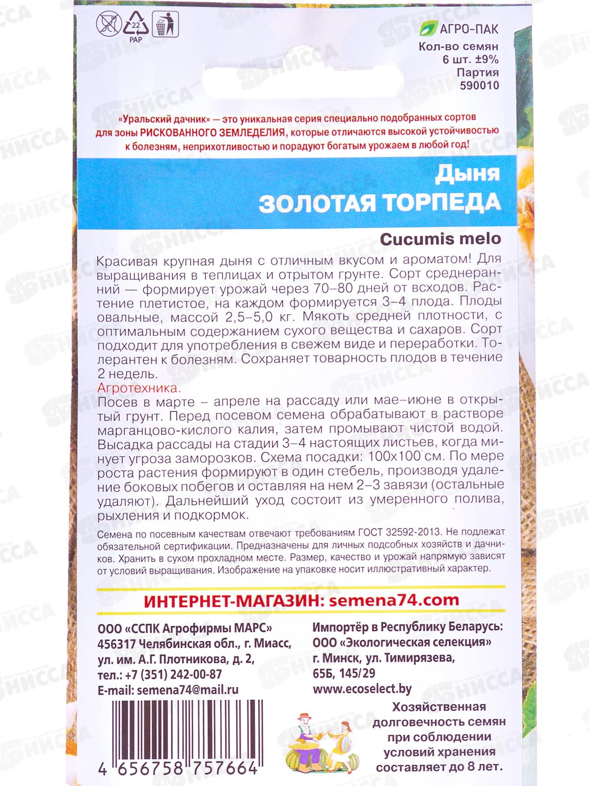 Красивая крупная дыня с отличным вкусом и ароматом! Для выращивания в теплицах и отрытом грунте. Сорт среднеранний – формирует урожай через 70–80 дней от всходов. Растение плетистое, на каждом формируется 3-4 плода. Плоды овальные, массой 2,5-5,0 кг. Мякоть средней плотности, с оптимальным содержанием сухого вещества и сахаров. Сорт подходит для употребления в свежем виде и переработки. Толерантен к болезням. Сохраняет товарность плодов в течение 2 недель.